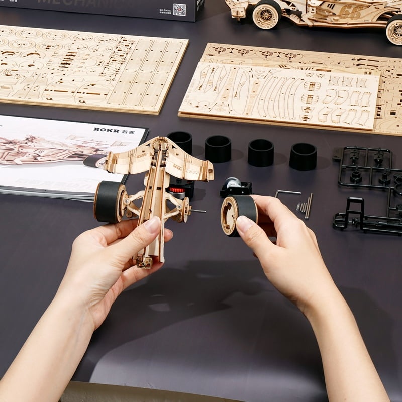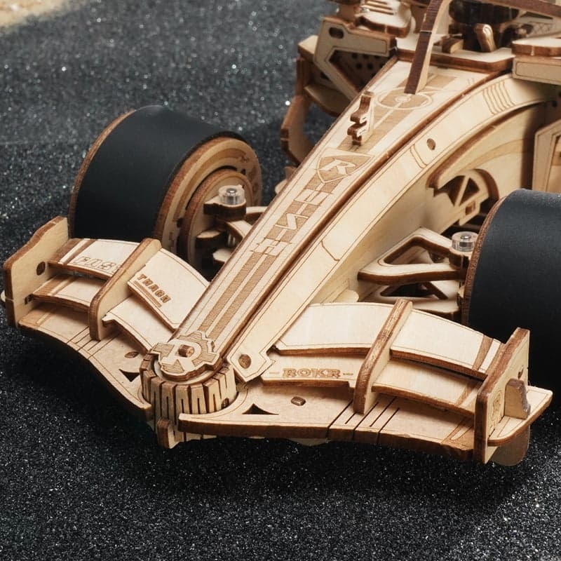Pregătește-te pentru o plimbare palpitantă cu o mașină de curse în cel mai recent puzzle 3D din lemn de la ROKR. Garantat să ofere o experiență plină de entuziasm și o cale rapidă spre distracție, acest model inspirat de Formula 1 este perfect pentru pasionații de mașini sau pentru oricine caută o experiență de curse provocatoare. Designul său elegant, aerodinamic și cadrul din lemn fin detaliat includ o aripă față aerodinamică, un eleron spate familiar, un bot ascuțit, o gardă la sol redusă și un cockpit strâns cu un șofer. Un nivel suplimentar de realism este oferit de angrenajele mecanice și componentele motorului expuse, prezentând sistemul de angrenaje planetare care asigură viraje line și mișcarea diferențială a roților, mai ales atunci când roțile durabile din silicon întâlnesc obstacole. De asemenea, dispune de o cutie de sunet care imită sunetul unui motor real de Formula 1. Această mașină nu necesită baterii! Pur și simplu rotește cheia și urmărește-o cum gonește. Fie că o pui pe birou sau o conduci cu mașina pe podea, mașina de curse ROKR îți va aprinde pasiunea pentru inginerie, design și atingerea liniei de sosire!