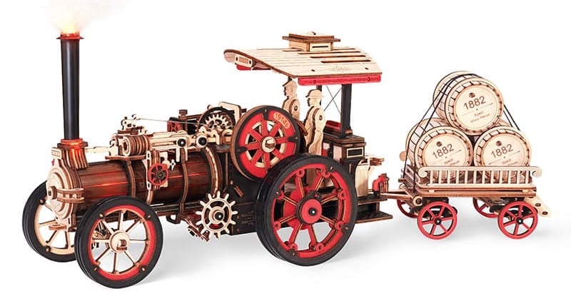 Este dotată cu un parasolar pliabil, un felinar asemănător unei flăcări, un volan rotativ și roți din silicon cu volante. Adăugați o remorcă cu 4 roți și sunteți gata să vă transportați marfa oriunde. Motorul cu aburi, cu impactul său asupra tehnologiei și societății, este cu adevărat o minune de privit. Fiți inovatori. Fiți creativi.