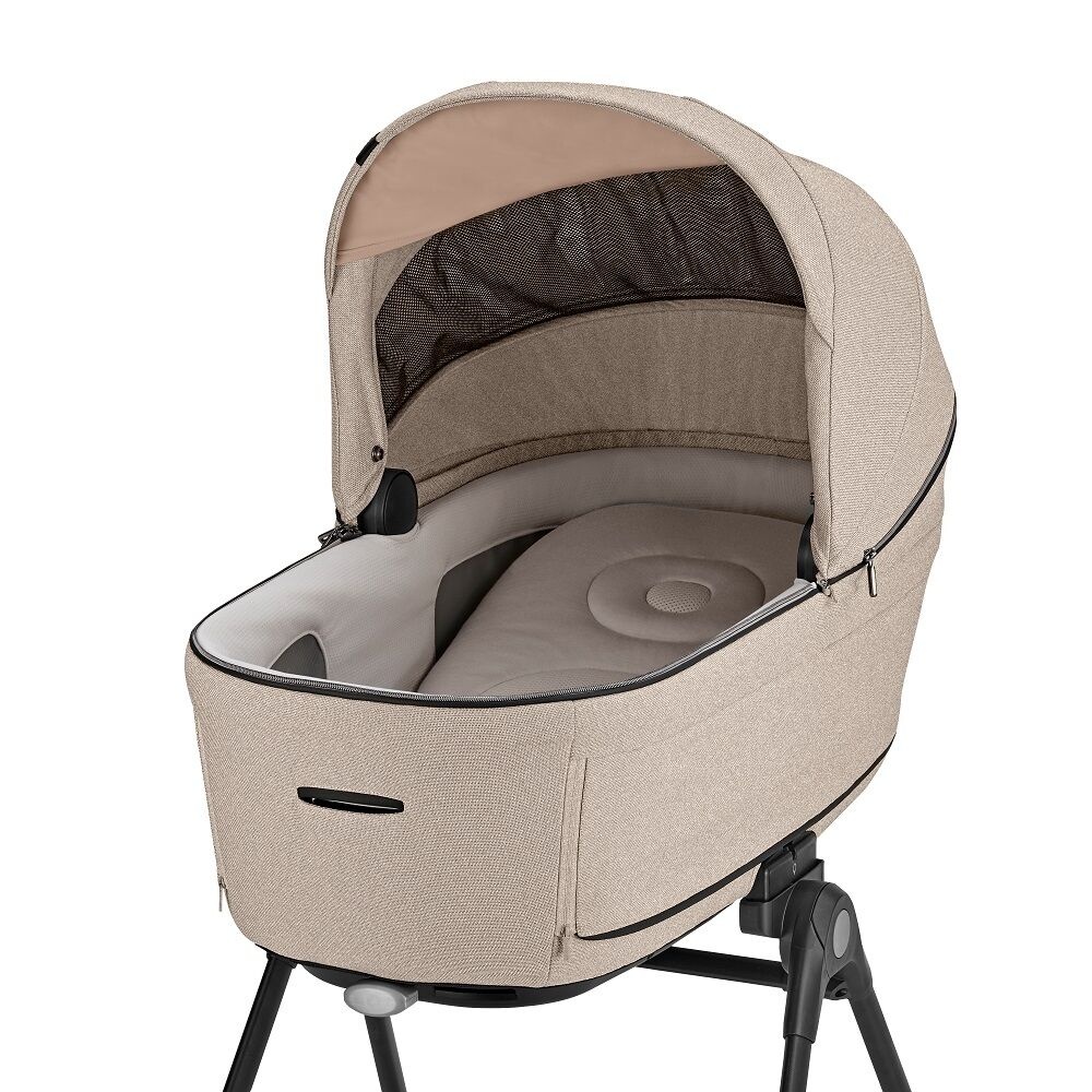 Scaunul poate fi instalat pe șasiu în direcția de mers sau cu fața spre părinte; Înclinarea spătarului este reglabilă în poziție orizontală; O glugă glisantă largă va proteja bebelușul atât de vânt pe vreme rece, cât și de soare într-o zi călduroasă; gluga este fabricată din material protector (UPF50+) și este echipată cu o vizieră suplimentară pentru soare; o inserție de plasă respirabilă în glugă va asigura un aflux de aer proaspăt; o husă pentru picioare va ține bebelușul de cald dacă afară este frig.