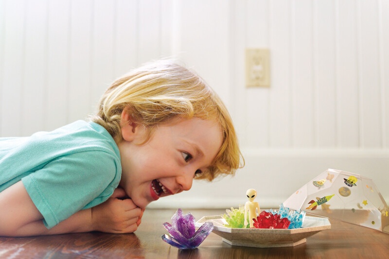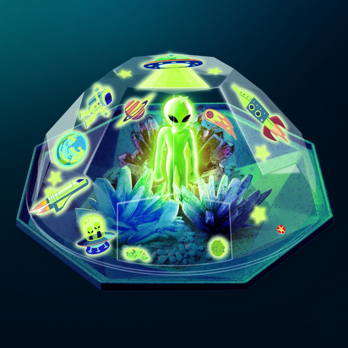 Intră în set1 figurină extraterestră, 1 foaie de autocolante luminoase, 1 pungă de pietriș, 1 sac de nisip, 2 compuși de cristal alb, 3 coloranți, 1 amestec de semințe albe, 1 bol de amestecare și lingură, pahare transparente de creștere (1 mare, 1 medie și 2 mici),