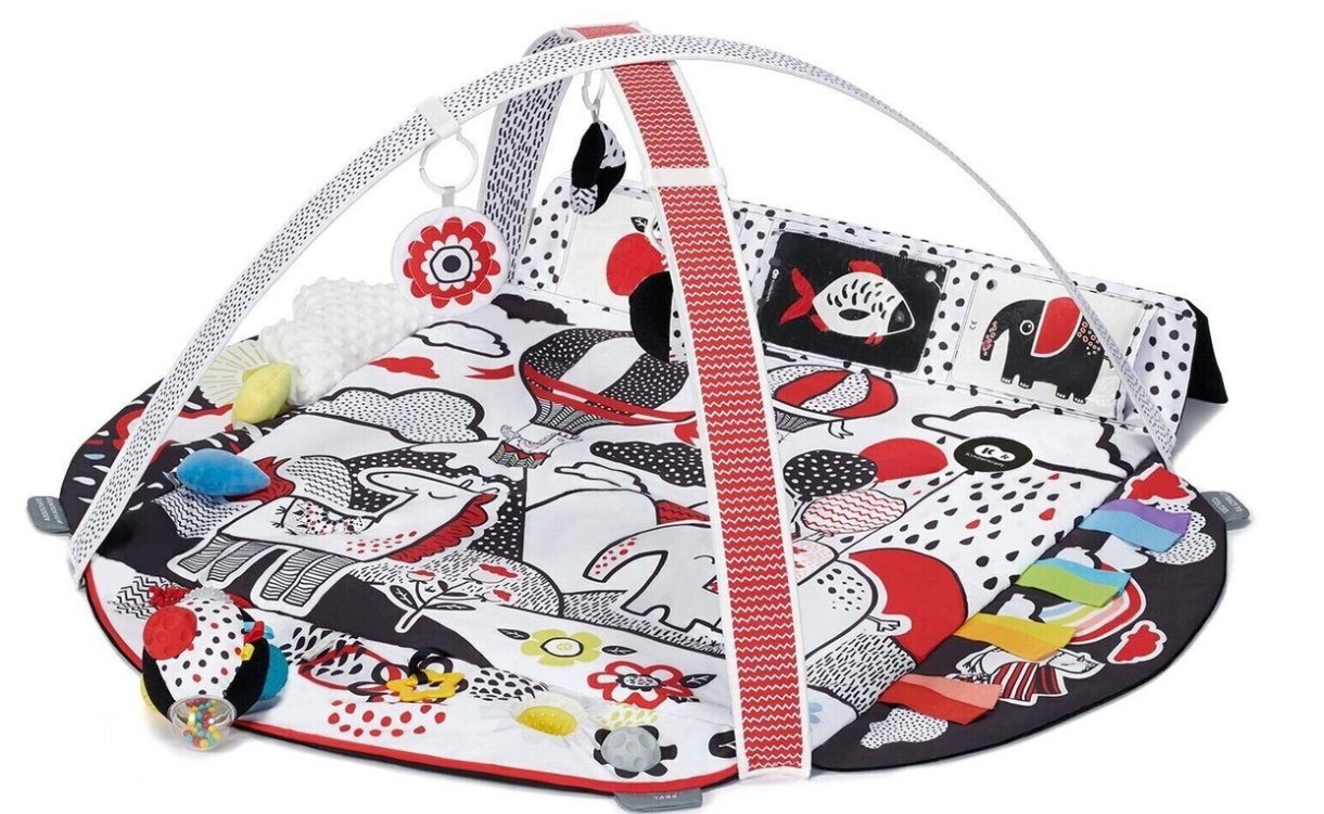 Setul include o varietate de jucării care stimulează simțurile: 12 cărți de contrast, o oglindă agățată, o minge agățată cu zăngănit, o jucărie agățătoare, o minge tactilă, o jucărie de pluș, panglici colorate și bile zornăitoare și o oglindă care poate fi plasat în spatele filmului.