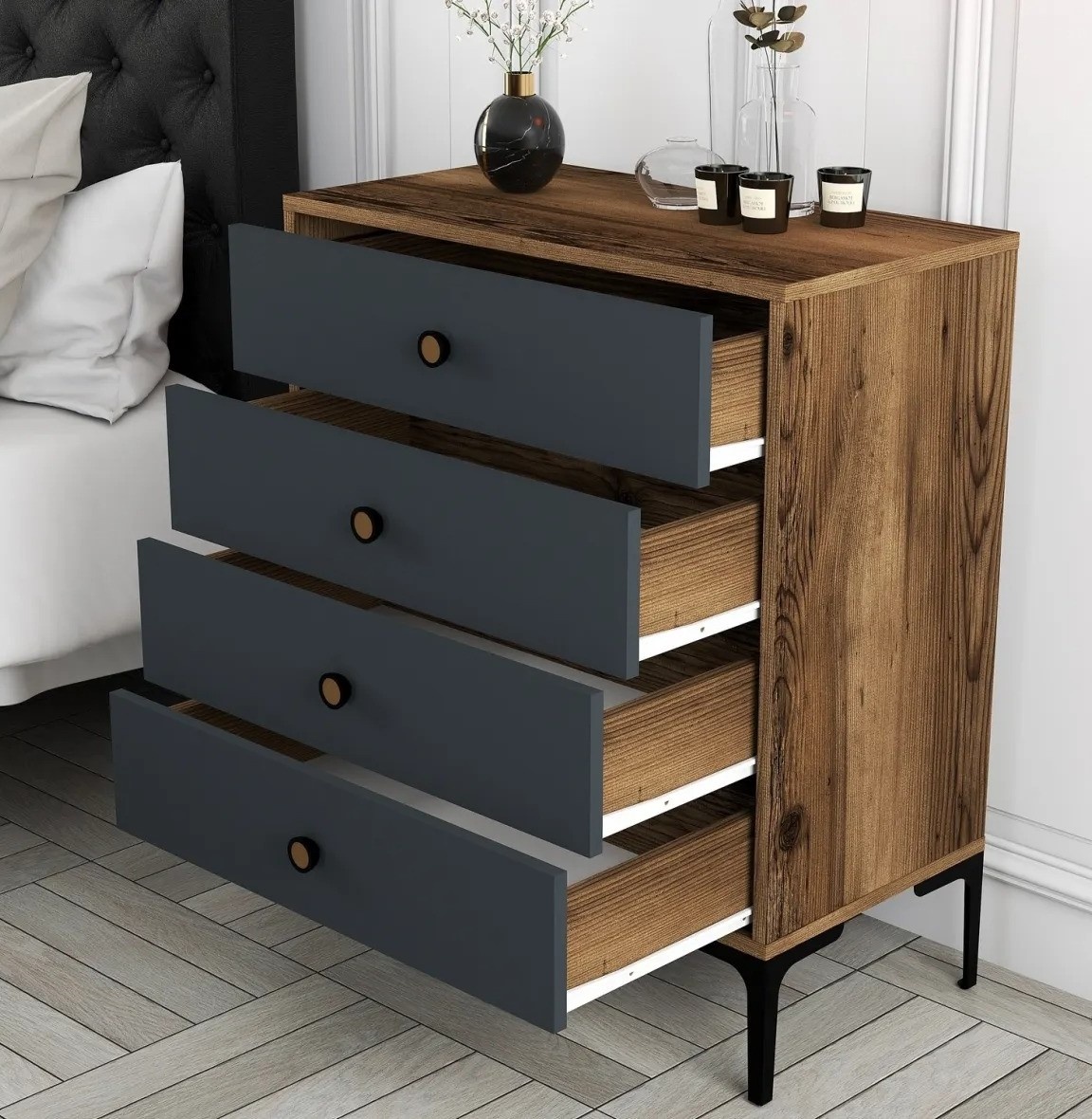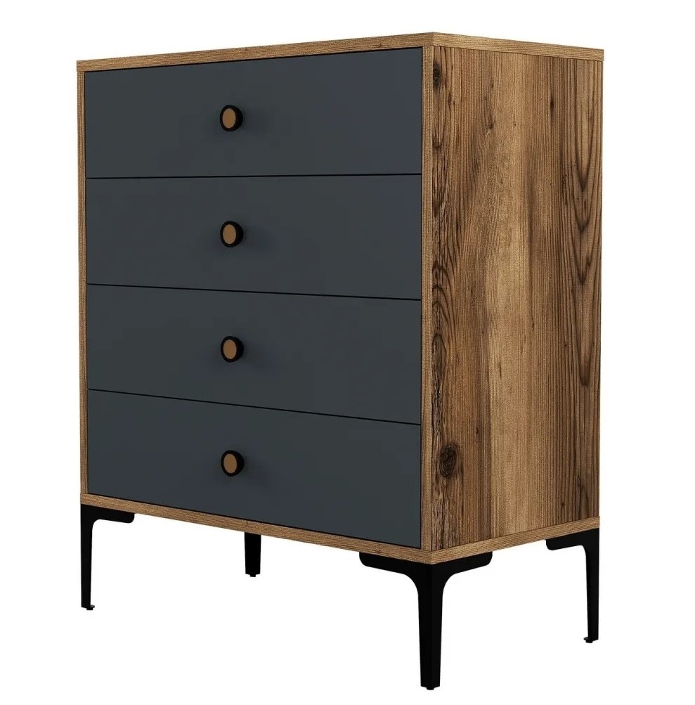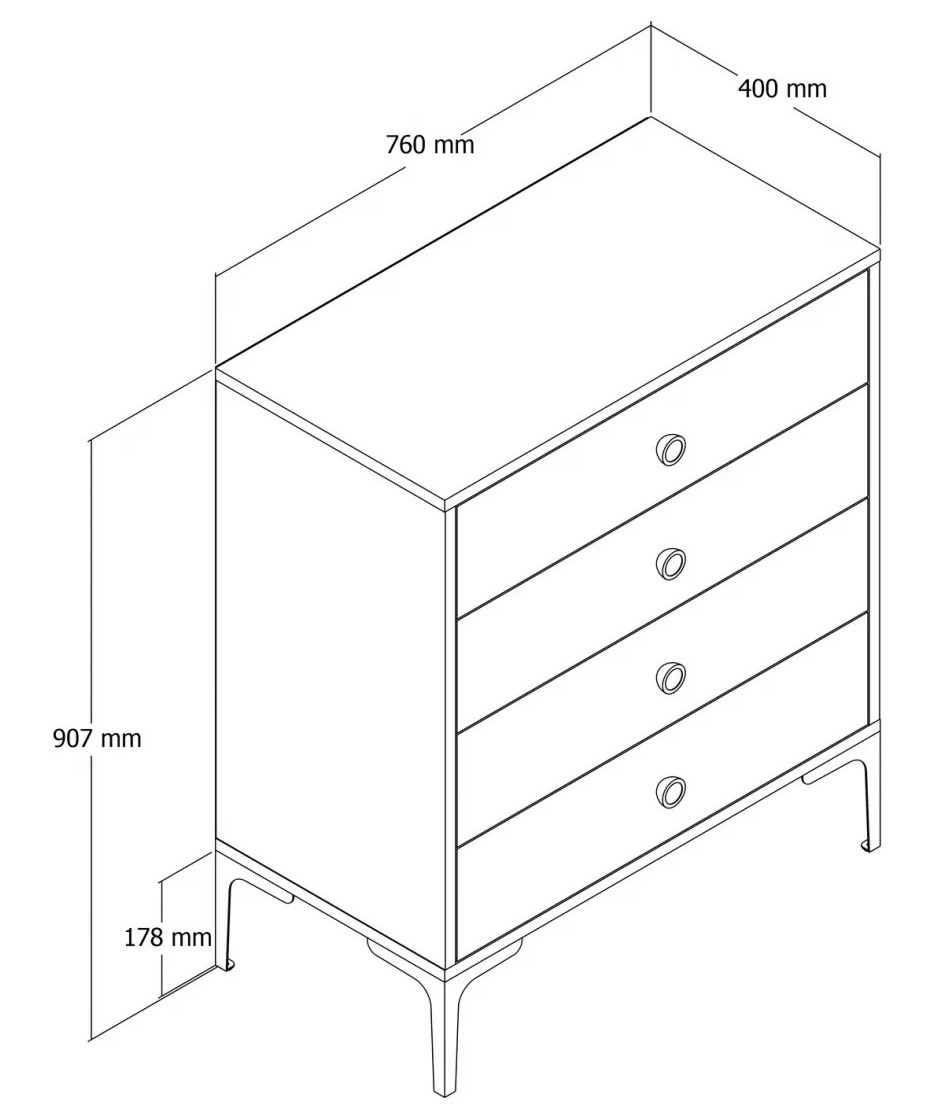 Cu patru sertare spațioase, această comodă oferă un spațiu amplu de depozitare pentru toate lucrurile tale esențiale. Fie că este vorba de haine, accesorii sau alte obiecte, puteți păstra cu ușurință totul organizat și la îndemână. Mânerele din plastic adaugă comoditate și facilitează deschiderea și închiderea sertarelor.