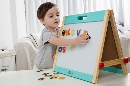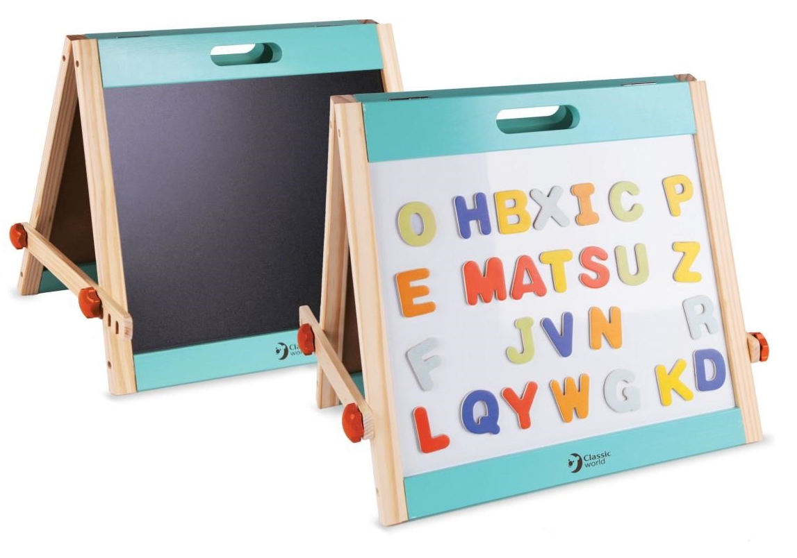 Tabla magnetica pentru desen cu două fețe din lemn Classic World vă va inspira copilul să fie creativ și să învețe. O parte a plăcii este folosită pentru desen cu cretă, iar cealaltă este magnetică pentru desen cu marker și pentru lipirea literelor magnetice. Tabla este fabricată din lemn natural, pentru producția sa se folosesc vopsele sigure. Setul vine cu 26 de litere magnetice.