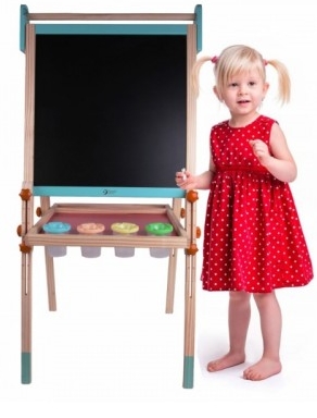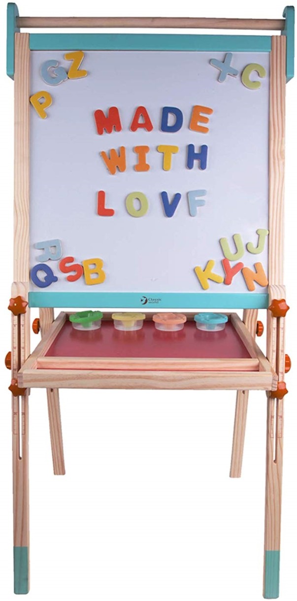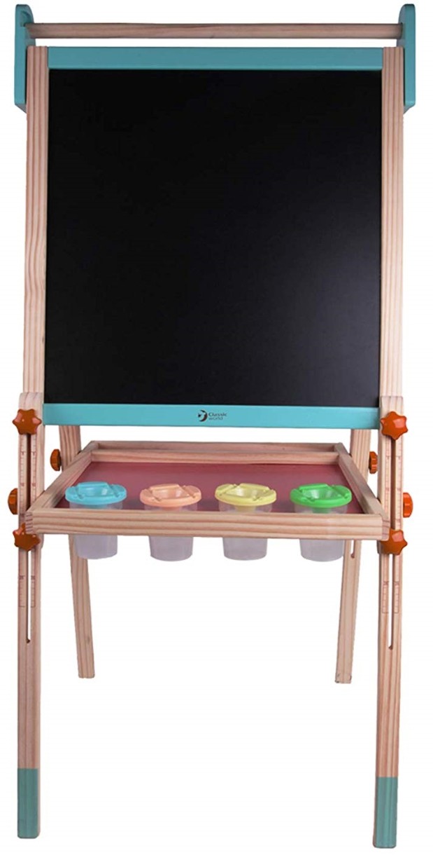 Tabla magnetica pentru desen cu două fețe din lemn Classic World vă va inspira copilul să fie creativ și să învețe. O parte a plăcii este folosită pentru desen, iar cealaltă este magnetică pentru desen cu marker și pentru lipirea literelor magnetice. Placa este fabricată din lemn natural, pentru producția sa se folosesc vopsele sigure. Kitul include litere magnetice și căni de plastic cu vopsea.