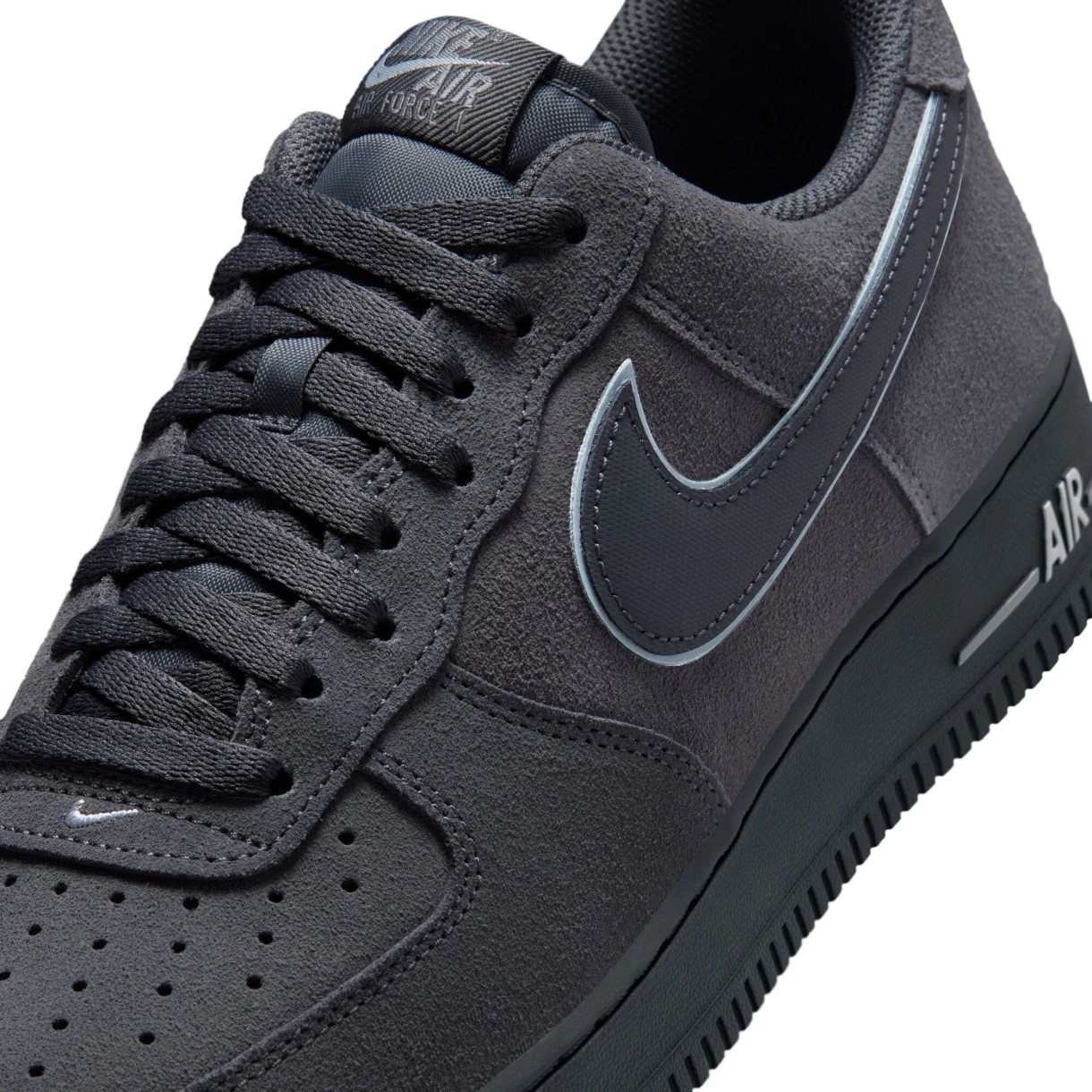 Silueta iconică Air Force 1 păstrează designul low-cut ușor de recunoscut, partea superioară rezistentă și perforațiile din zona vârfului pentru o mai bună ventilație. Combinația de culori Anthracite, Cool Grey și Wolf Grey oferă un aspect versatil și elegant, ușor de asortat atât cu ținute casual, cât și sport.