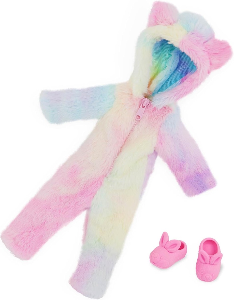 Rafa este îmbrăcată într-o salopetă pufoasă multicoloră și are ochi frumoși violet, gene moi și păr lung roz care poate fi coafat. Păpușă Rafa în salopetă și papuci iepuraș, pat cu abțibild curcubeu, saltea, pătură, pernă, înghețată de jucărie, lingură, jurnal, pix, lanternă, jucărie moale, ojă, periuță de dinți și multe altele.
