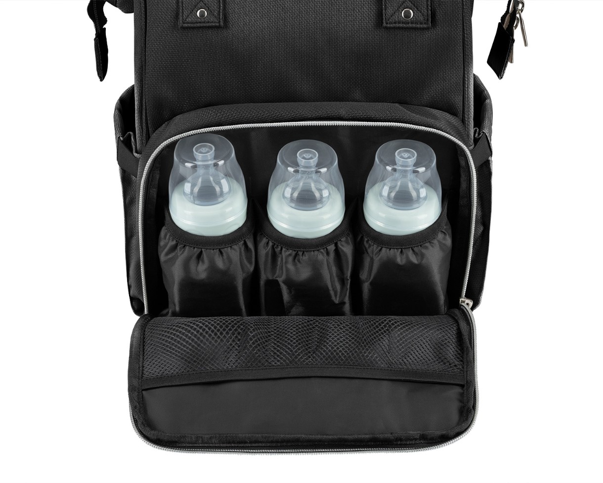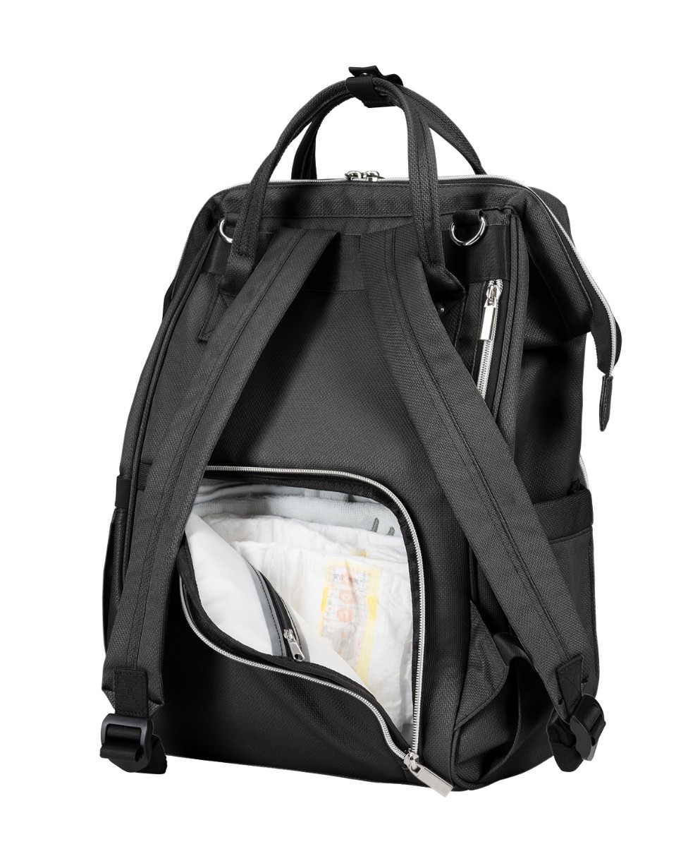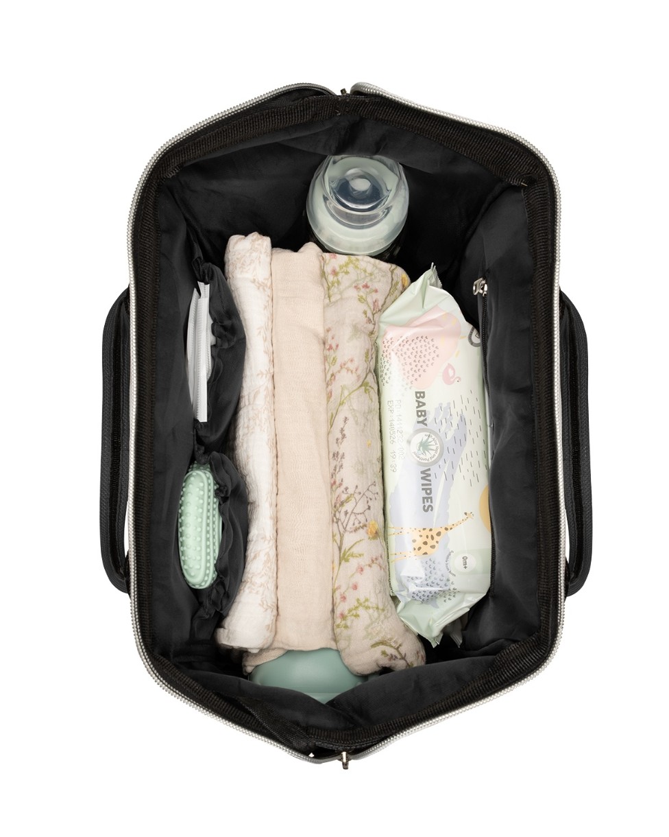 Material textil luxos melanj. Este inclusă o saltea de înfășat. Cleme pentru atașare ușoară la mânerul căruciorului. Buzunarul principal se deschide larg pentru acces facil. Organizatoare pentru scutece și haine. Un buzunar impermeabil pentru obiecte ude. 3 compartimente pentru biberoane mențin apa sau laptele cald timp de câteva ore. Un fermoar din spate oferă acces la partea de jos a compartimentului principal. Este inclus un suport pentru chei. Sistem elastic de ajustare a mânerului. Potrivit atât pentru geantă, cât și pentru rucsac. 100% poliester.