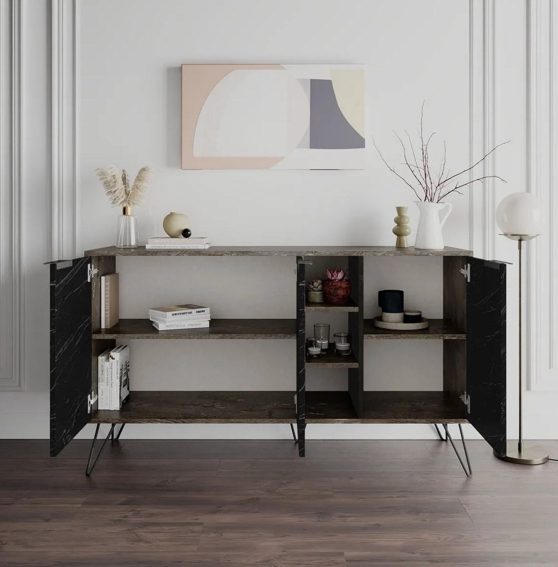 Cu numeroase rafturi, această consolă oferă un spațiu amplu de depozitare pentru toate bunurile dvs. Fie că doriți să vă expuneți piesele de decor preferate sau să vă păstrați lucrurile esențiale organizate, această consolă vă acoperă toate necesitățile. Grosimea sa de 18 mm asigură robustețea, în timp ce picioarele metalice adaugă o notă contemporană.