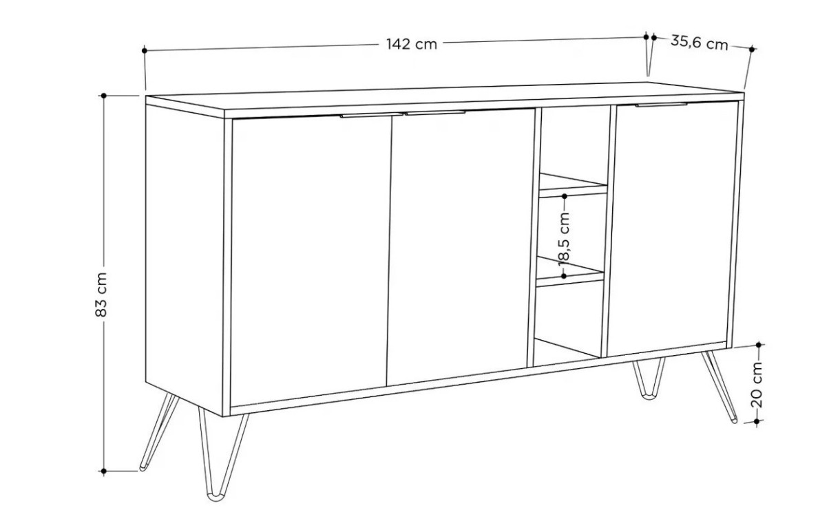 Dimensiunile consolei de 142 cm lățime, 83 cm înălțime și 35. 6 cm în adâncime o fac să se potrivească perfect pentru orice cameră. Înălțimea picioarelor sale de 20 cm adaugă un sentiment de deschidere, făcând ca spațiul dvs. să pară mai mare. În plus, această consolă poate fi fixată cu ușurință pe perete, economisind spațiu prețios pe podea.