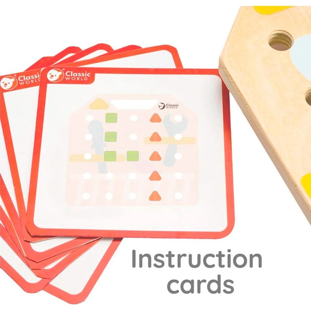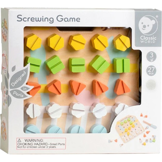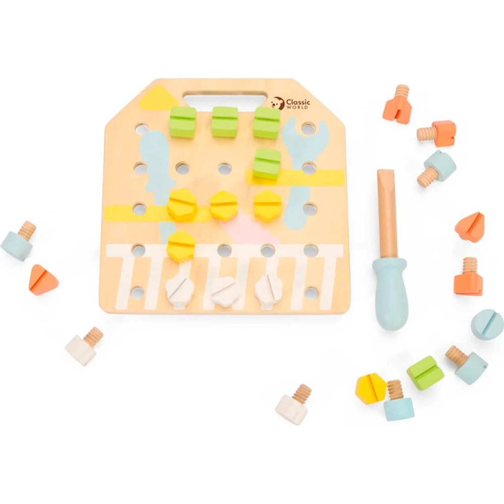 Placă de lemn pentru înșurubarea șuruburilor – un set ideal pentru copii, pentru dezvoltarea motricității fine și a coordonării mâinilor. Setul include diferite șuruburi și unelte care permit copilului să exerseze în siguranță înșurubarea și desfășurarea acestora. Dezvoltă atenția, răbdarea și gândirea logică, pregătind copilul pentru viitoarele activități cu unelte și construcții. Fabricat din lemn de calitate, sigur pentru copii.