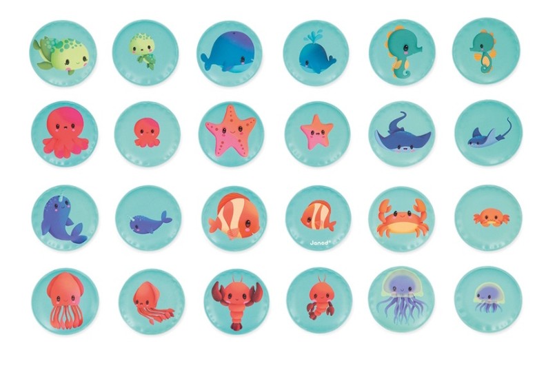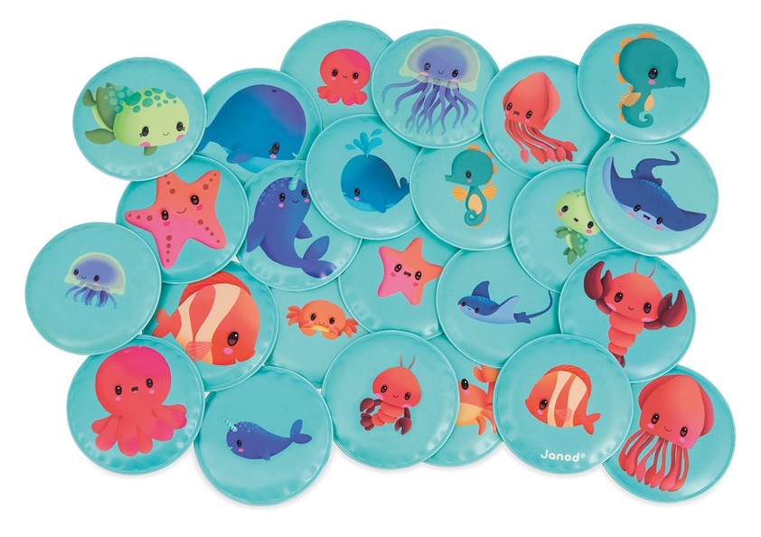 Ajută-ți copilul să găsească toți puii de animale cu acest joc de memorie pentru baie Janod! Acest joc de memorie conține 12 perechi de animale, iar scopul jocului este de a potrivi tatăl sau mama cu bebelușul lor. Perfect potrivite pentru baia de baie, aceste 24 de piese de spumă plutesc și se lipesc de cadă sau de plăci atunci când sunt ude. Ideale pentru a petrece timp cu familia în timp ce te distrezi! Prin intermediul acestui joc, copilul tău își va dezvolta abilitățile de memorie în timp ce descoperă fauna marină. Potrivit pentru copii cu vârsta de 2 ani și peste.
