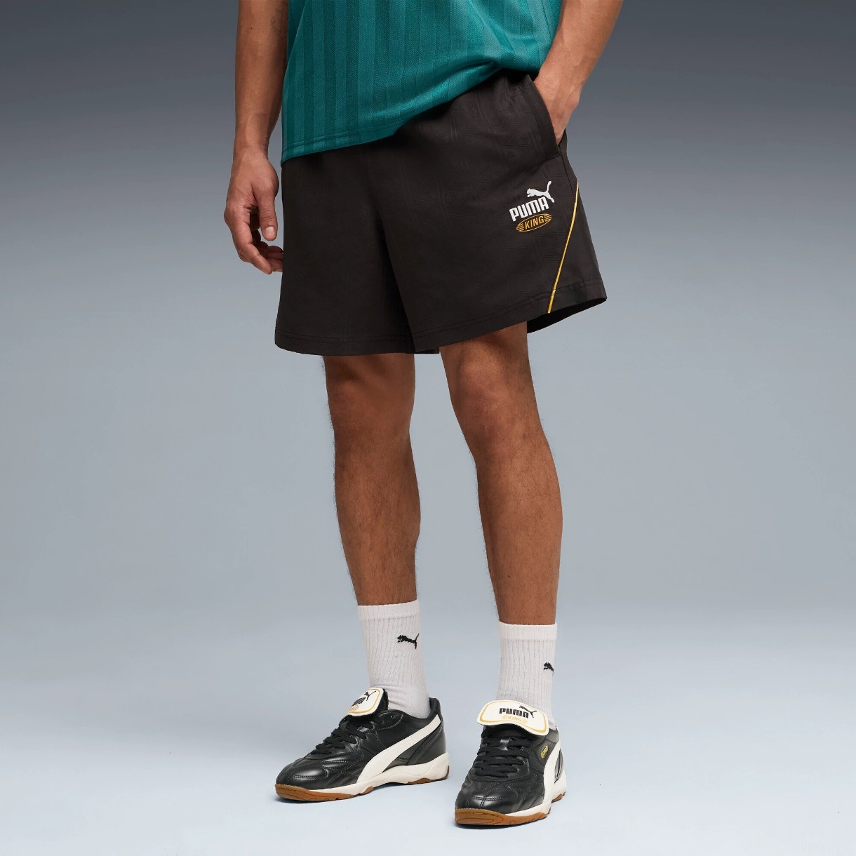 Logo-ul brodat PUMA KING pe partea stângă a coapsei evidențiază moștenirea fotbalistică și identitatea colecției. Modelul este realizat din 100% poliester reciclat, susținând un proces de producție mai responsabil.