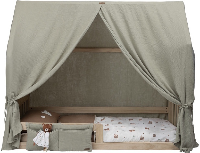Organizatorul este prevăzut cu două buzunare pentru depozitare, oferind spațiu suplimentar în jurul pătuțului și ajutând la menținerea ordinii fără efort. Produsul este compatibil cu pătuțurile tip căsuță Montessori, ceea ce îl face versatil și ușor de integrat într-un mediu prietenos pentru copil.