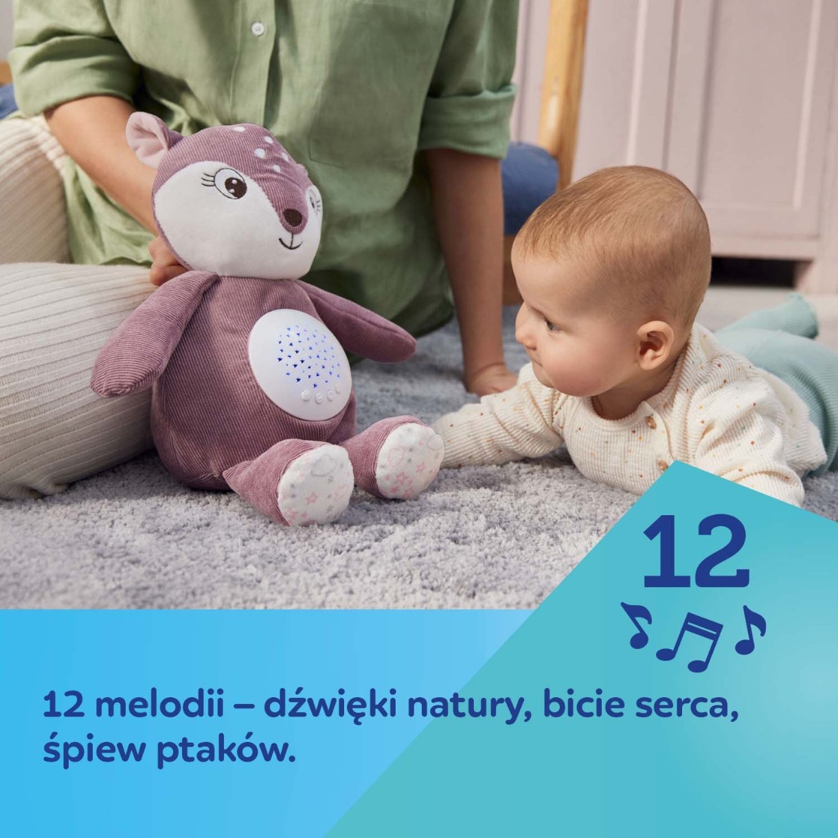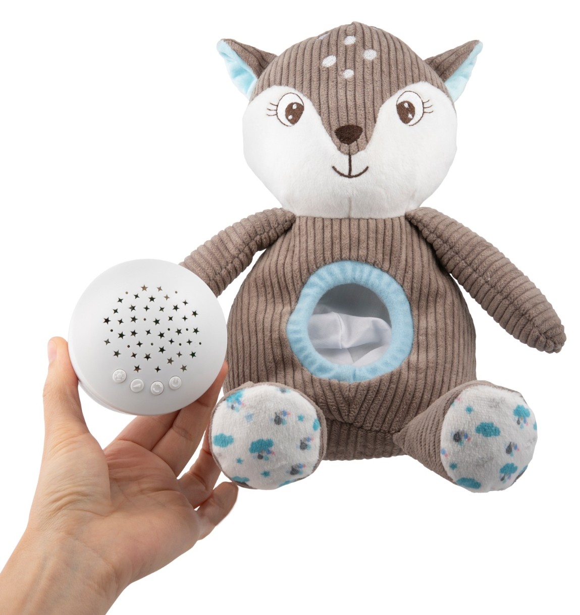 perfect pentru somnul unui copil. O mascota moale de pluș, cu un mecanism ascuns în burtă, care afișează stele colorate și cântă melodii relaxante, va calma copilul și îi va fi mai ușor să adoarmă. Jucăria de pluș funcționează în 3 moduri de funcționare. Poate emite melodii și proiecții de lumină din burtă, doar melodii sau doar lumini delicate, servind astfel drept lampă de noapte. Puteți alege dintre 12 melodii calme, inclusiv sunetele delicate ale naturii, cântul păsărilor și bătăile inimii și posibilitatea de a seta 5 niveluri de volum, în funcție de preferințele bebelușului. După 30 de minute, jucăria se va opri automat. Cadoul perfect de la nastere. Disponibil in 2 variante de culoare, pentru un baiat si o fata. Puteți păstra cu ușurință Cerbul curat, după ce ați scos mecanismul de pe burtă, puteți spăla mascota manual.