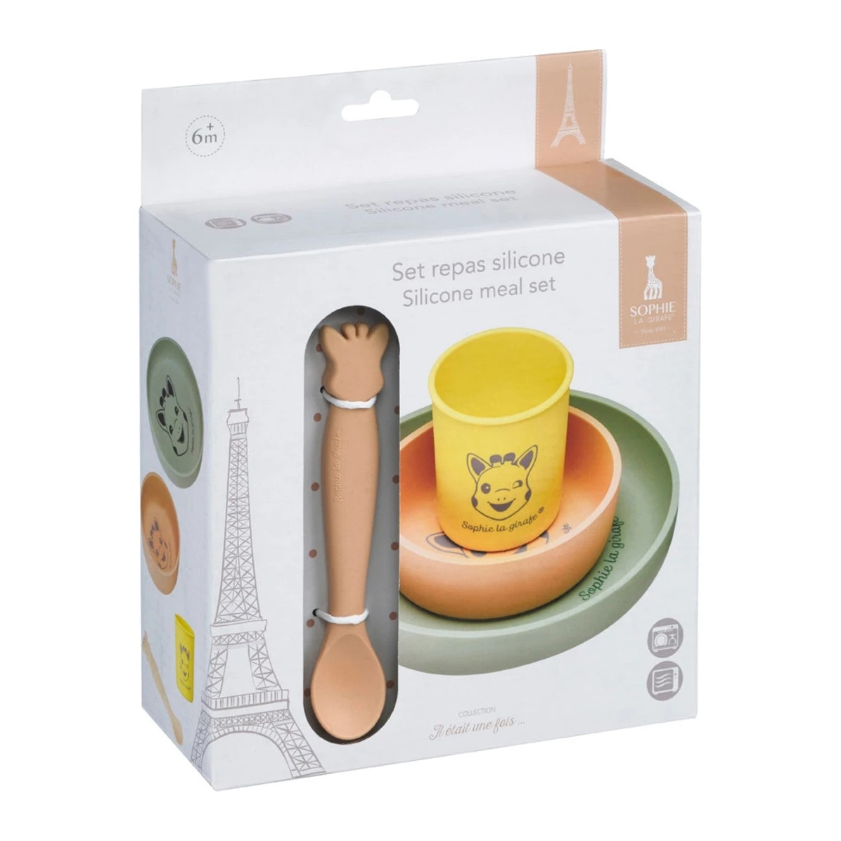 Fiecare element este ușor de curățat, compatibil cu mașina de spălat vase și poate fi folosit în cuptorul cu microunde. Imaginea adorabilului personaj Sophie la Girafe transformă fiecare masă într-un joc plăcut și ajută copilul să învețe să mănânce singur.