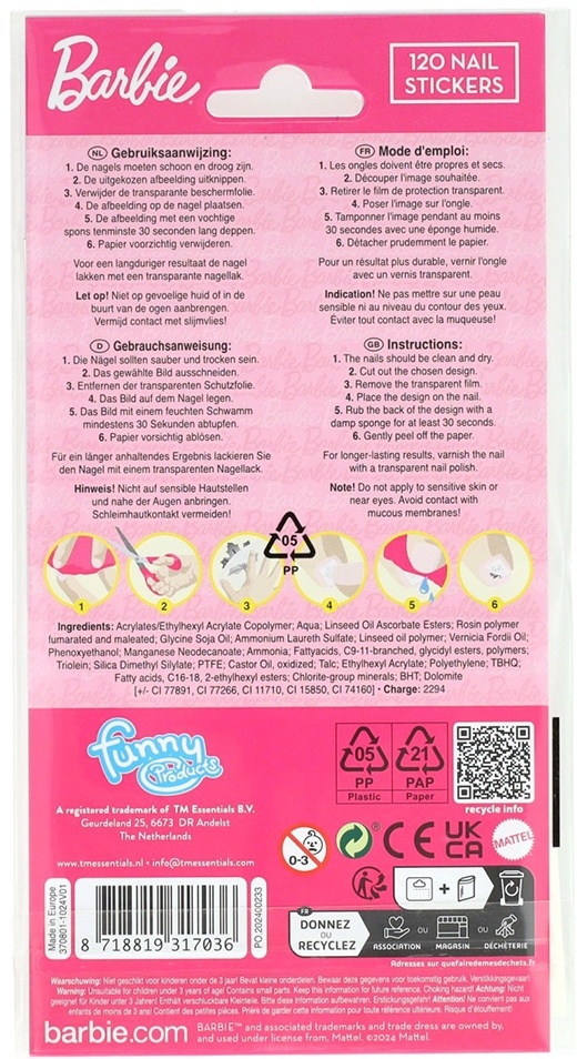 Funny Products Barbie (FP37080100) este un set de 120 stickere pentru unghii cu motive Barbie, perfecte pentru fetițele care adoră să‑și decoreze unghiile într-un mod distractiv și creativ. Stickerele se aplică și se îndepărtează ușor, oferind modele vii și jucăușe.