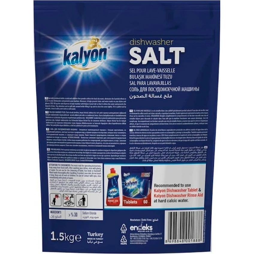 Sarea pentru mașina de spălat vase KALYON dedurizează apa pentru a îmbunătăți eficiența de curățare a detergentului și a elimina urmele de pe obiectele dvs. de veselă.