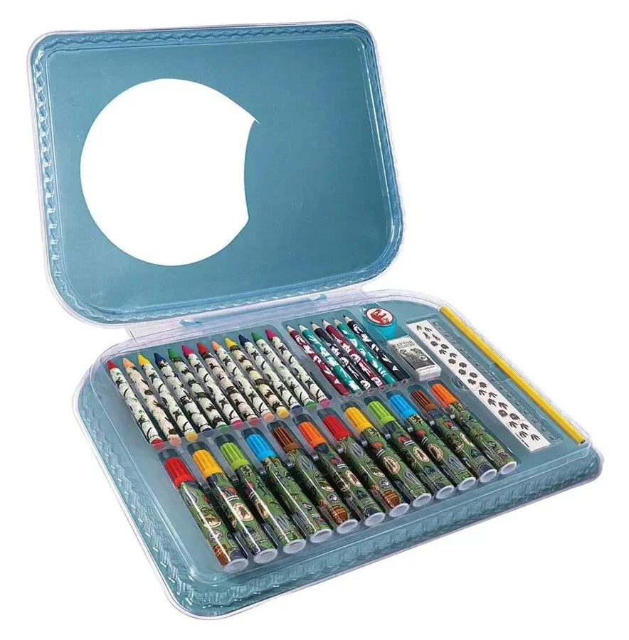 In set12 creioane colorate, 12 markere, 6 creioane, 1 riglă, 1 creion, 1 radieră, 1 ascuțitor