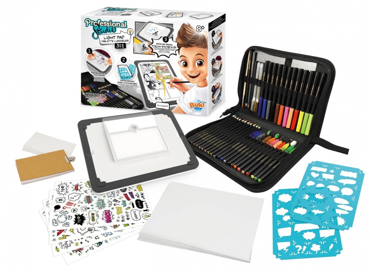 Tableta A5 de desen iluminata cu LED de la Buki France este un dispozitiv destinat copiilor care le ofera posibilitatea de a crea lucrari unice si personalizate. Fiind dotata cu o suprafata luminata cu LED, aceasta le permite copiilor sa copieze cu usurinta orice desen sau sa creeze benzi desenate cu personajele lor preferate. Lucrarile vor fi mult mai detaliate si desenate cu o precizie mai buna fata de metoda clasica de desen.