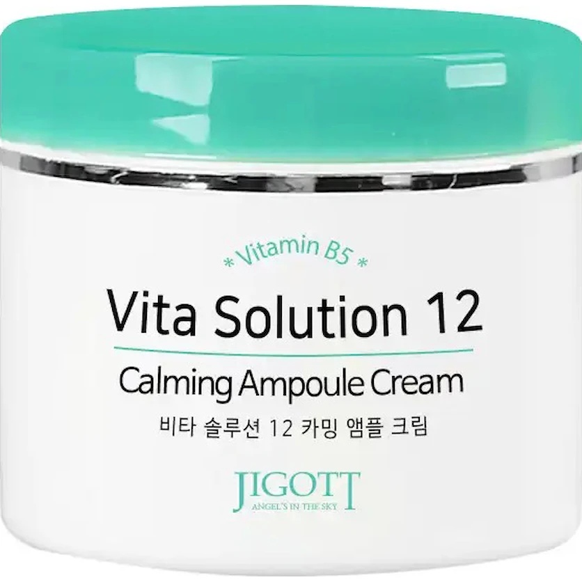Jigott Vita Solution 12 Calming Ampoule Cream 100 ml este o cremă ampulă calmantă pentru față cu vitamina B5 și un complex de ingrediente vegetale active, concepută pentru a reduce iritațiile, fortifica bariera cutanată și hidrata profund. Este ideală pentru pielea sensibilă, iritată sau obosită, precum și după proceduri cosmetice agresive sau expunere la factori de stres externi.