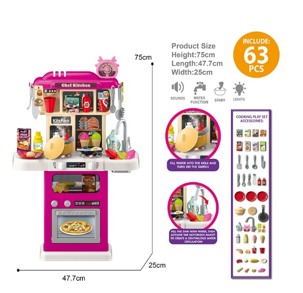 În fața dumneavoastră se află visul unei tinere bucătărese – o bucătărie de jucărie cu iluminare cu efect de foc, generator de abur, redă sunete de gătit și include 64 de accesorii de bucătărie!
