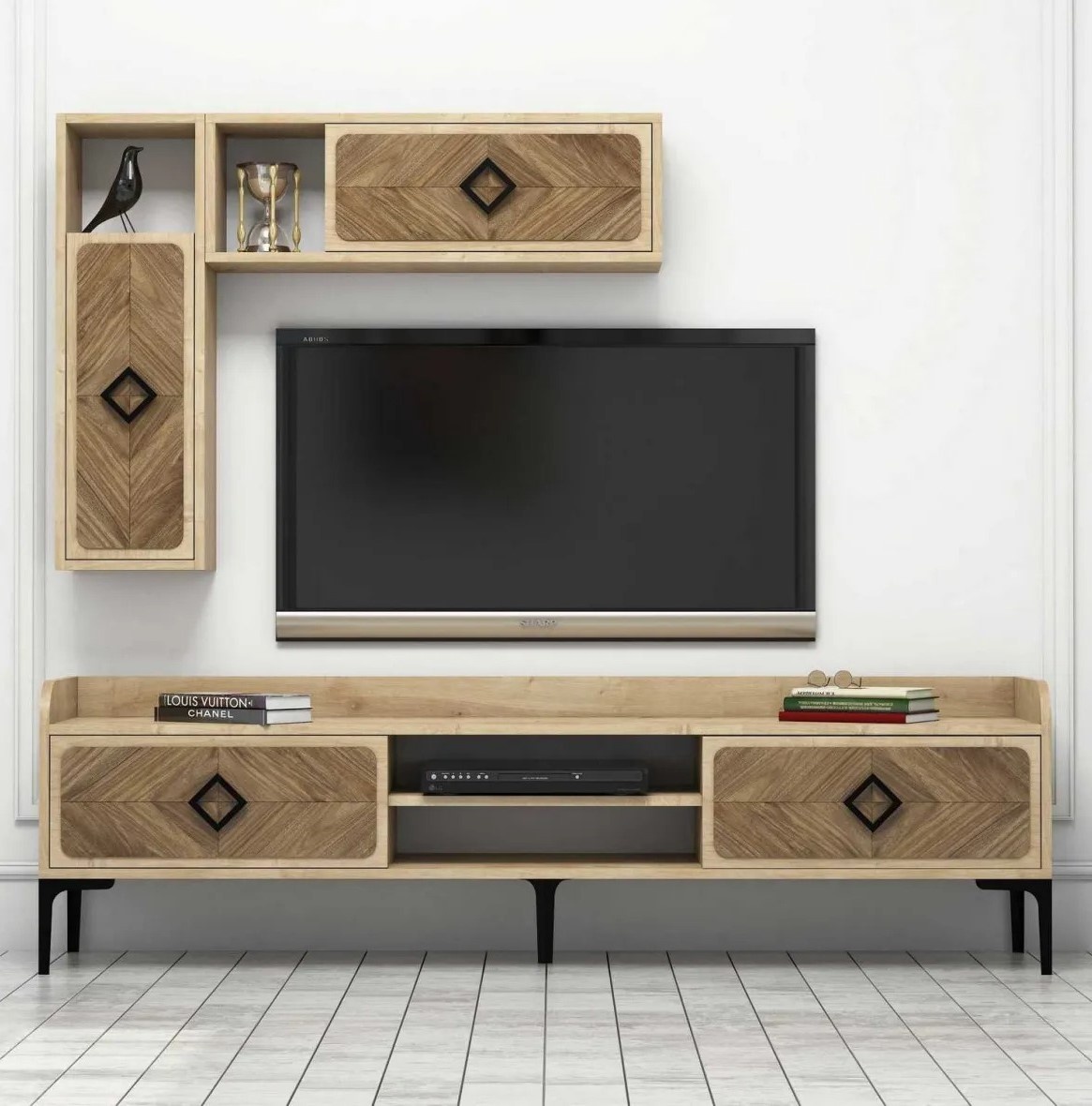 Numeroasele rafturi oferă loc suficient pentru toate elementele media esențiale. De la DVD-uri la console de jocuri, totul rămâne organizat și la îndemână. Raftul de perete inclus adaugă funcționalitate și stil suplimentar.