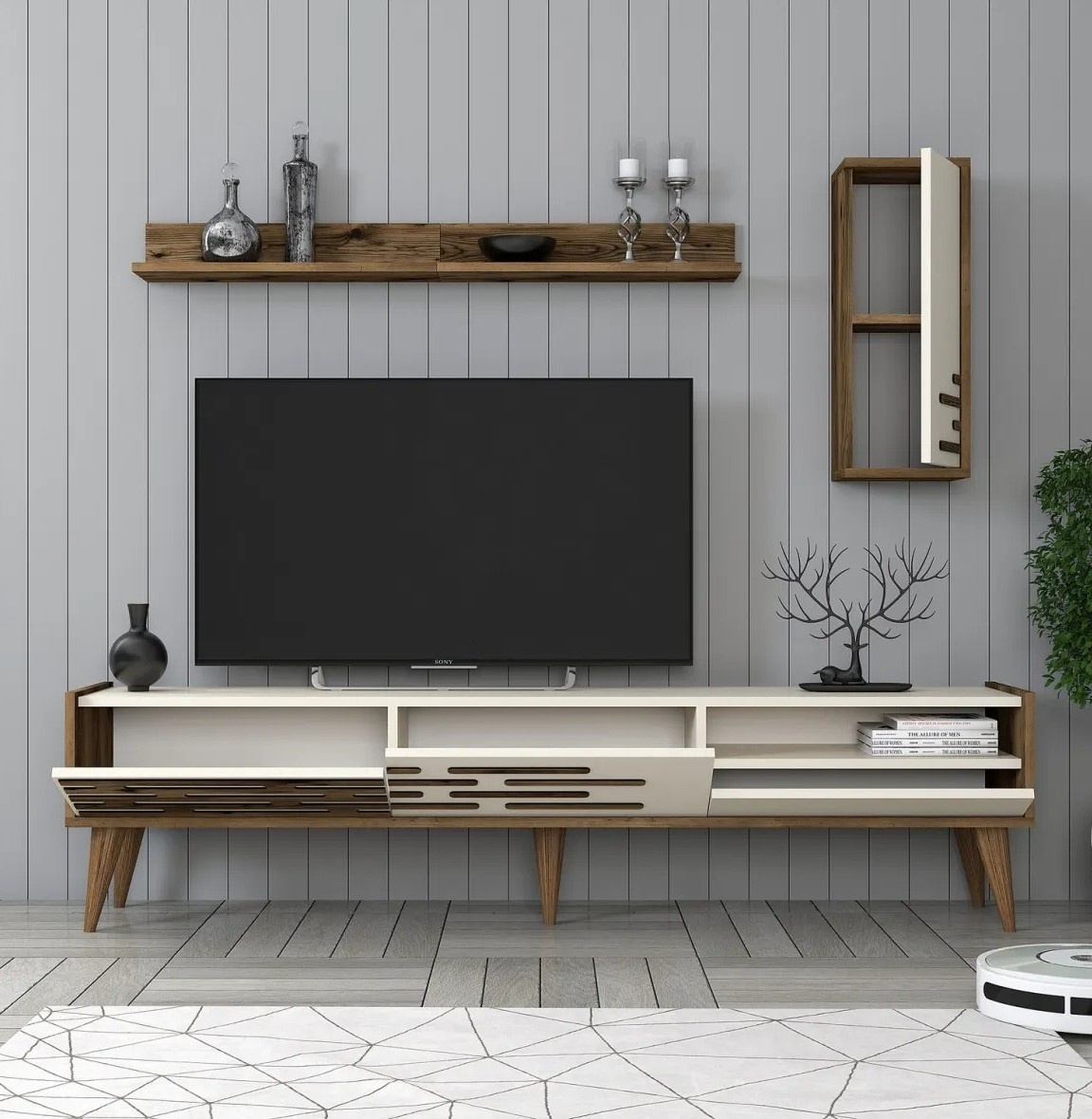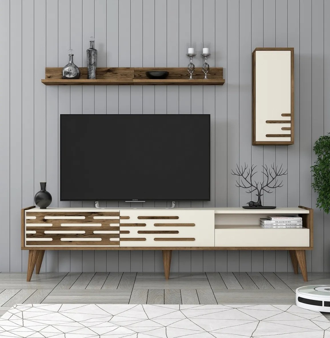 Dimensiunile generoase și rafturile multiple oferă numeroase opțiuni de depozitare. Zona centrală este ideală pentru televizor, iar raftul de perete și dulapul oferă spațiu suplimentar pentru dispozitive media, cărți și obiecte decorative.