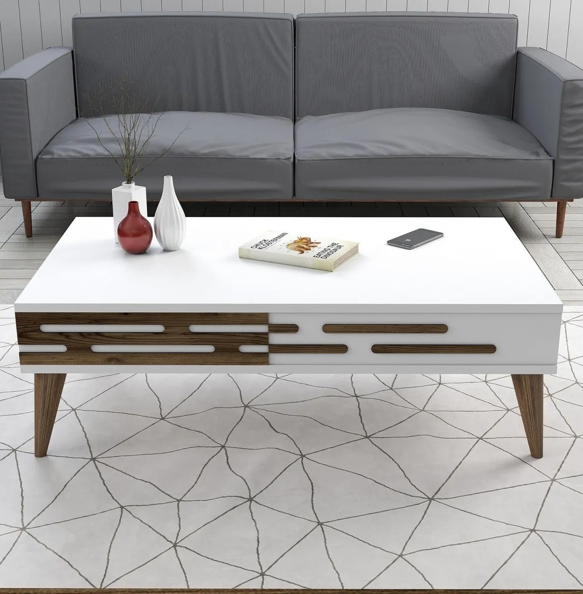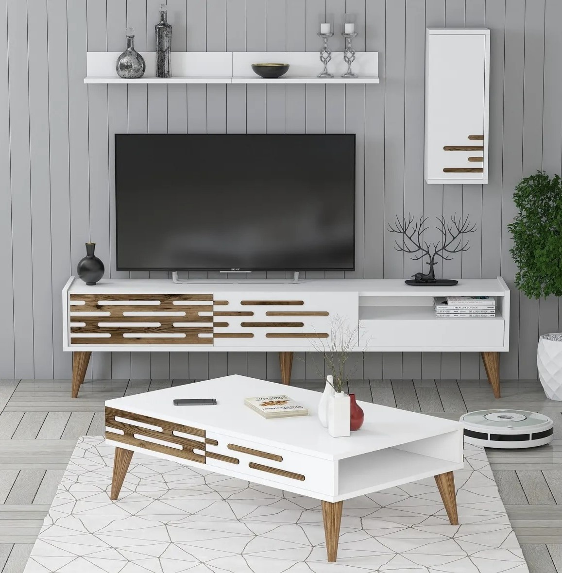 Setul include suport pentru televizor, raft de perete, dulap și măsuță de cafea, oferind spațiu generos pentru depozitare. Obiectele rămân organizate, iar zona de living devine mai funcțională și mai ordonată.