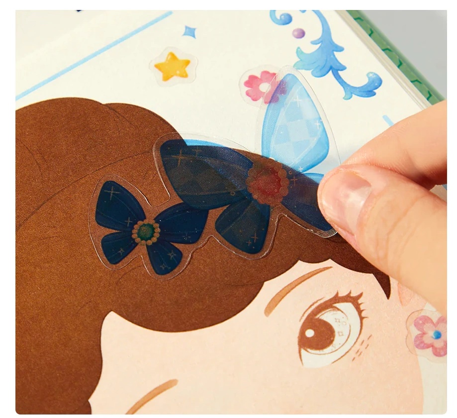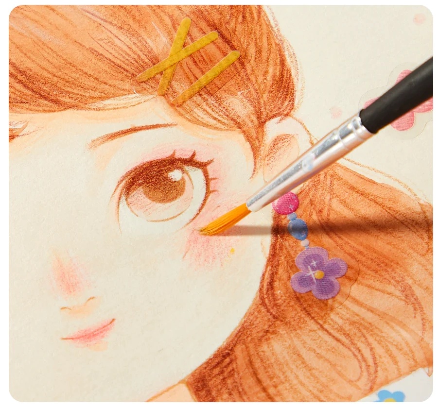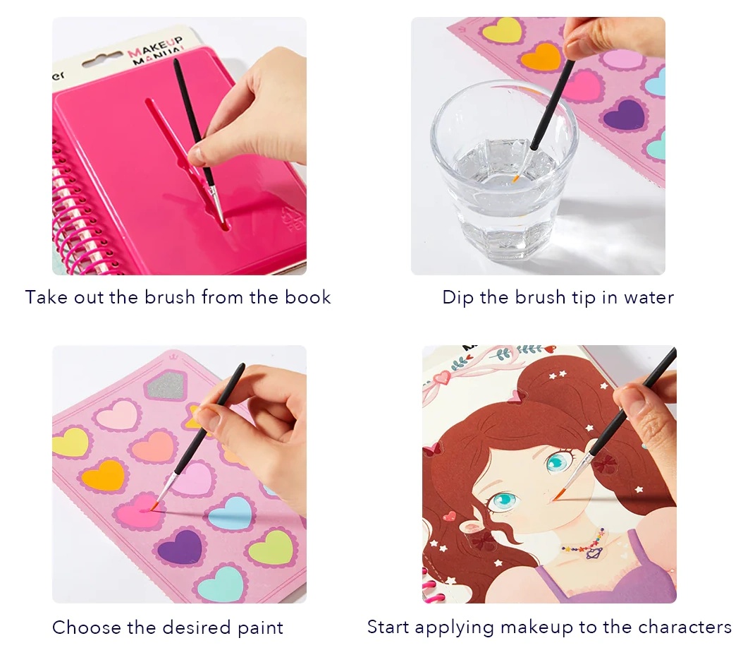In set1 pensulă, 2 hârtie cu vopsea, 3 autocolante, 1 placă goală, 2 lipici