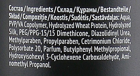 Aqua, PVP / VA Copolimer, Proteine de grâu hidrolizate, Mătase hidrolizată, PEG / PPG-15/15 Dimeticonă, Diazolidinil uree, Metilparaben, Propilparaben, Clorură de cetrimoniu, Polisorbat 20, Parfum, Butilfeniloxil metilpropil, hidroxil