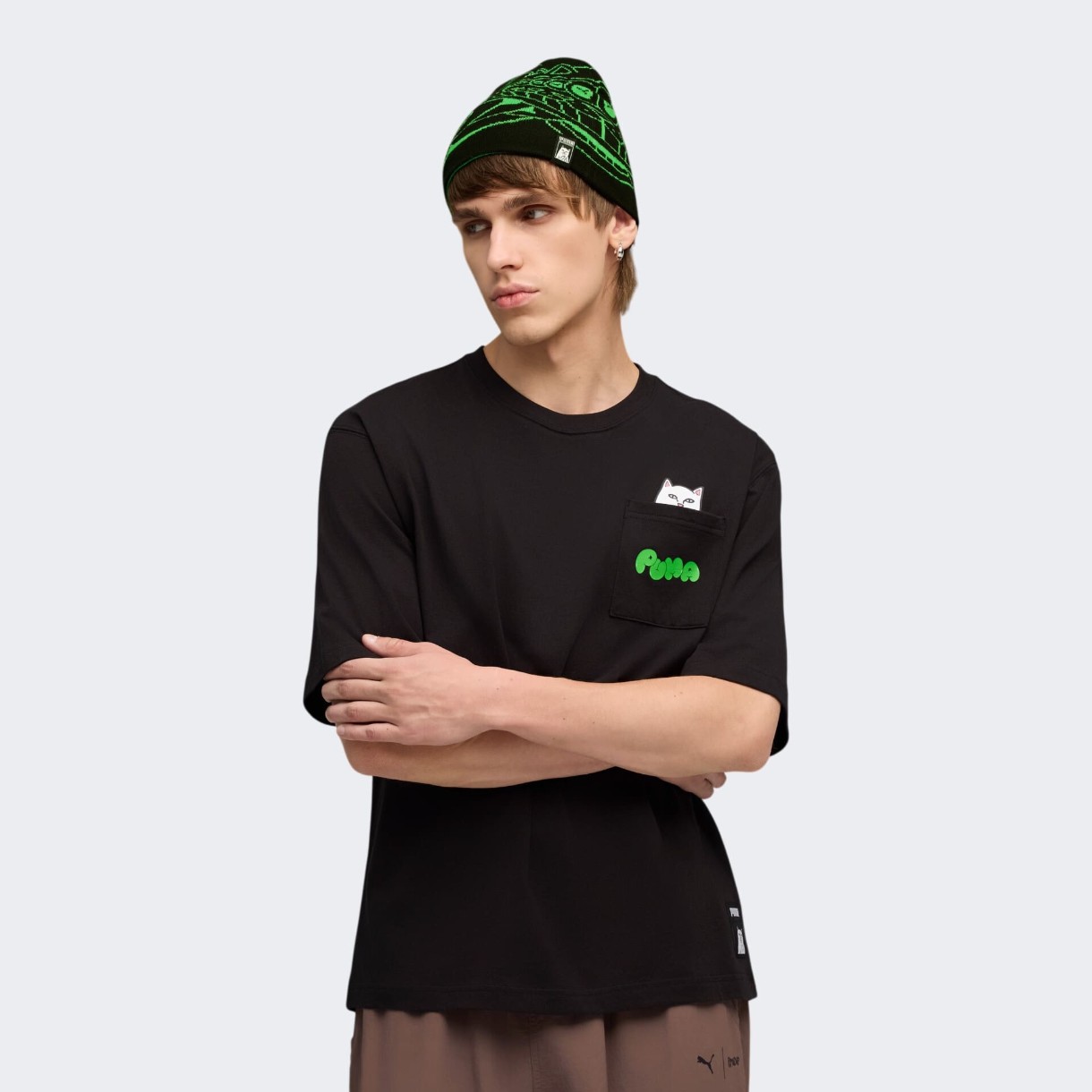 Buzunarul de pe piept, cu imprimeu grafic PUMA x RIPNDIP, devine punctul de atracție al modelului, adăugând o notă jucăușă și un caracter unic ținutei. Eticheta de brand aplicată pe lateral completează designul cu un detaliu îndrăzneț. În plus, utilizarea materialelor reciclate face din acest tricou o alegere mai responsabilă pentru mediul înconjurător.