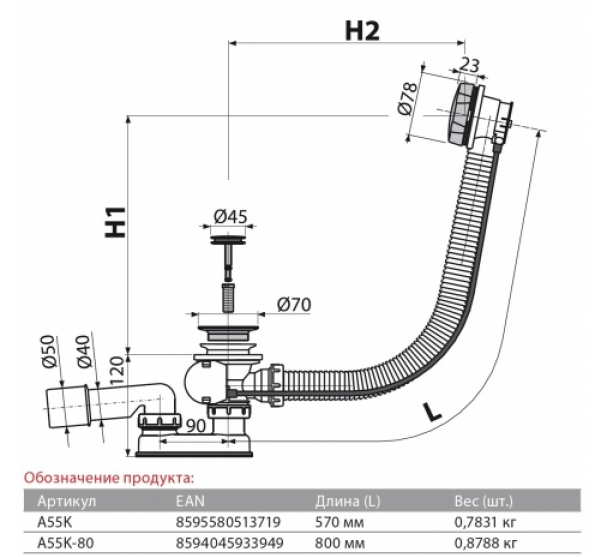 Sifon pentru cada Alcaplast A55KM-80 70" 40 (81814)