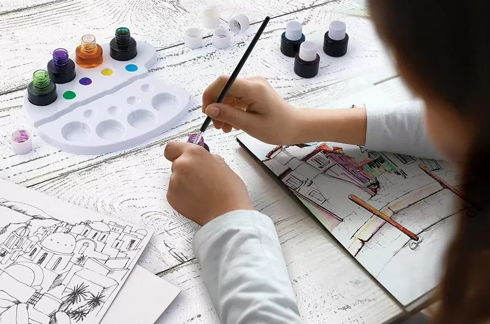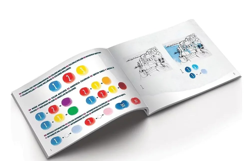 In set8 acuarele, paletă, 2 perii, dozator, 2 lucrări de artă pretipărite, 2 lucrări de artă cu contur în ceară pretipărite, un ghid cuprinzător ilustrat pentru învățarea tehnicilor de pictură în acuarelă