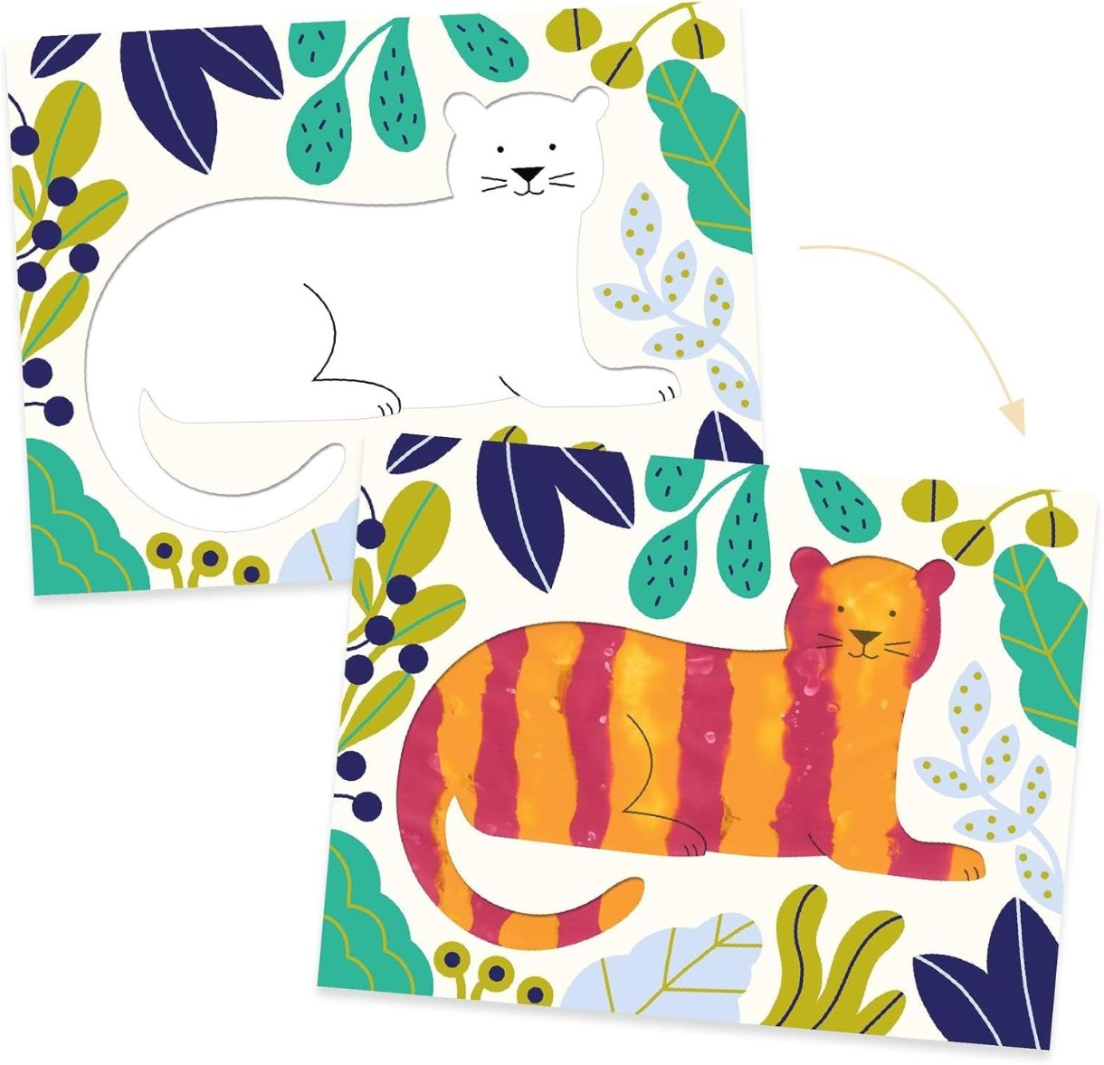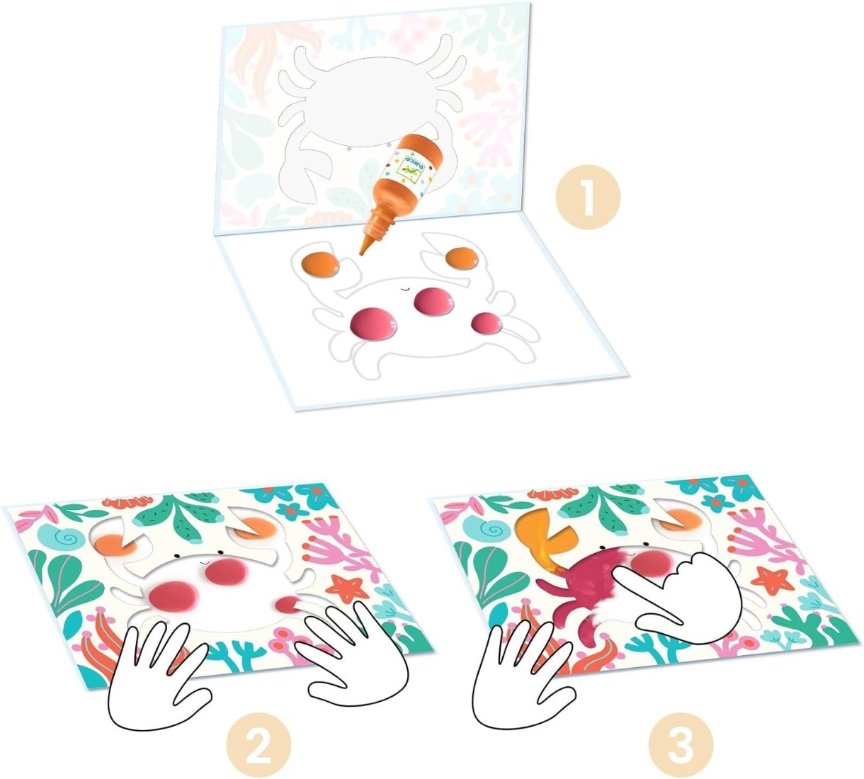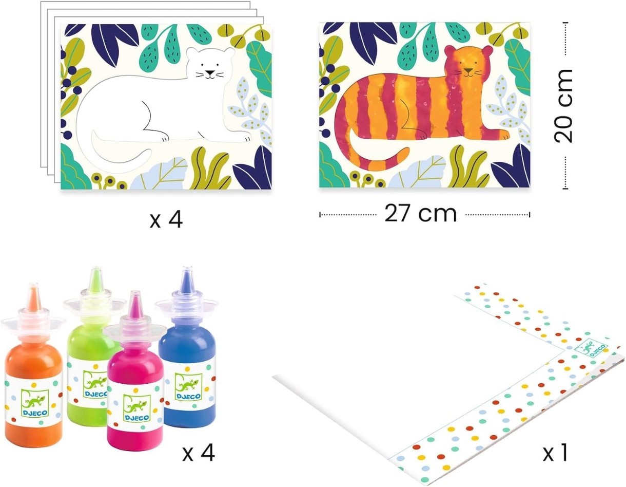 In set4 buzunare din plastic lavabile cu ilustrații, 4 sticle de guașă (roșu, portocaliu, albastru și verde), 1 broșură cu instrucțiuni pas cu pas