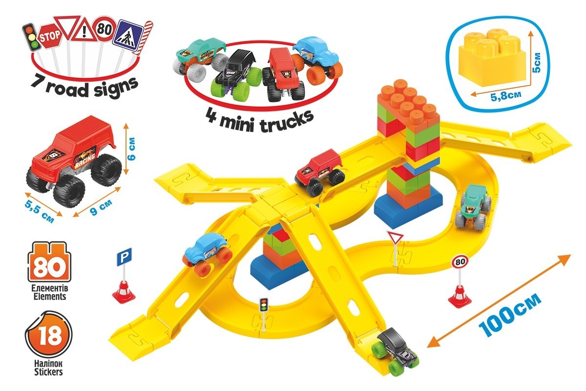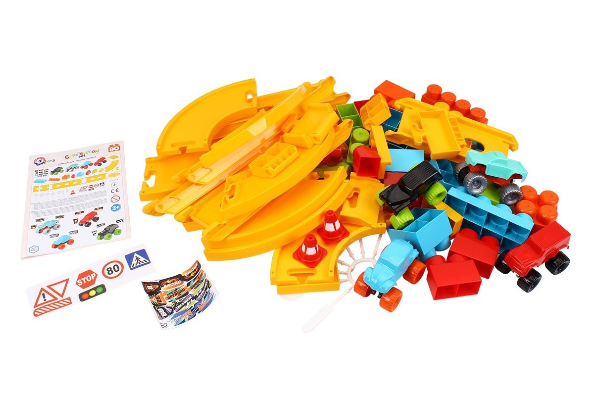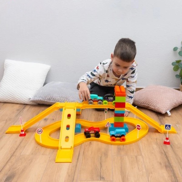 Setul conține 80 de elemente: piese pentru traseu cu intersecții și curbe, rampe, indicatoare rutiere și mașinuțe. Piesele se conectează ușor, oferind libertatea de a crea diferite configurații de drum.