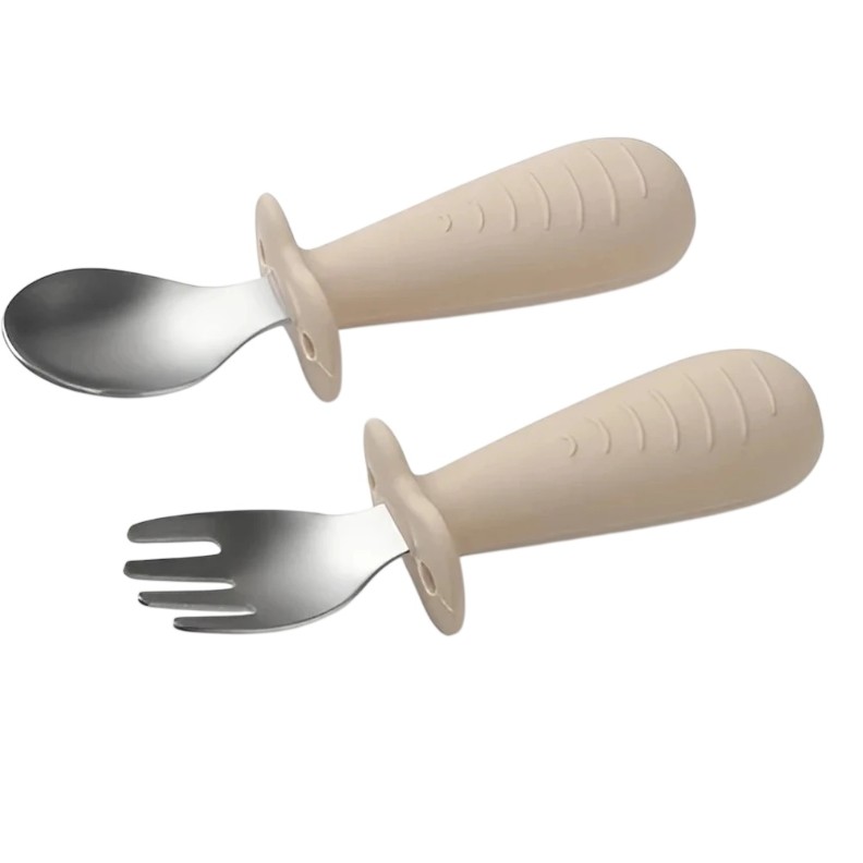 - Lingurița și furculița din oțel inoxidabil sunt rezistente și durabile. Mânerele din silicon alimentar fără BPA previn alunecarea din mâna copilului. Tacâmurile vor fi folosite timp îndelungat.