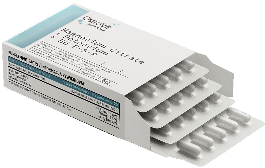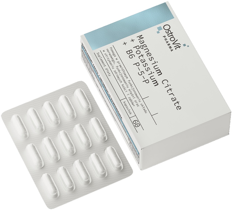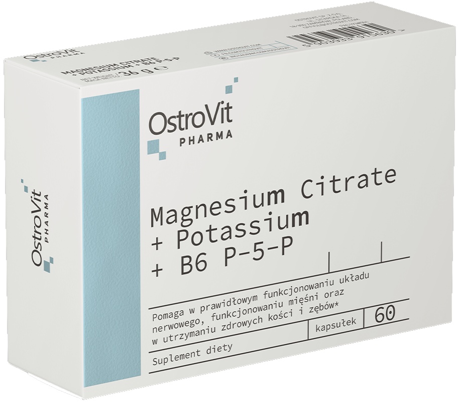OstroVit Pharma Citrat de Magneziu + Potasiu + B6 P-5-P este un supliment alimentar de înaltă calitate, care reprezintă o sursă de magneziu, potasiu și vitamina B6. Este un produs din linia premium OstroVit Pharma, disponibil sub formă de capsule ușor de înghițit. Este un produs creat pentru consumatorii conștienți, care doresc să-și completeze dieta zilnică cu microelemente valoroase.