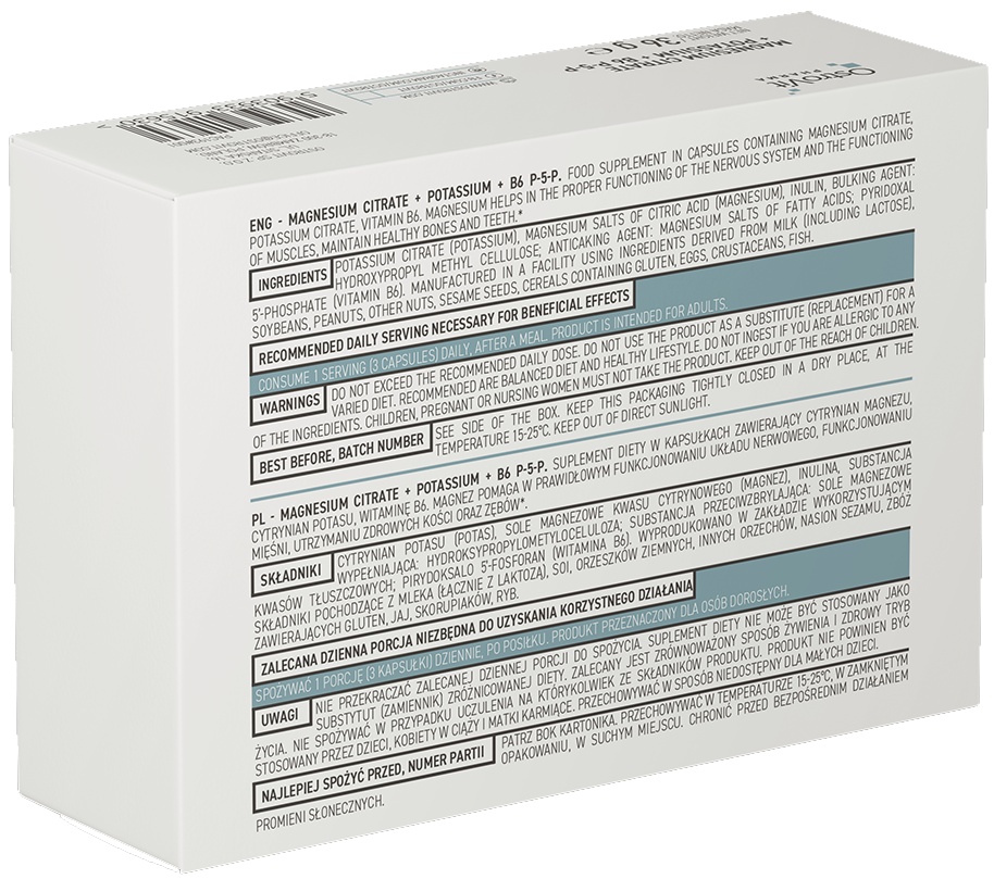 Citrat de potasiu (potasiu), săruri de magneziu ale acidului citric (magneziu), inulină, capsulă: hidroxipropilmetilceluloză; agent antiaglomerant: săruri de magneziu ale acizilor grași; piridoxal 5’-fosfat (vitamina B6).