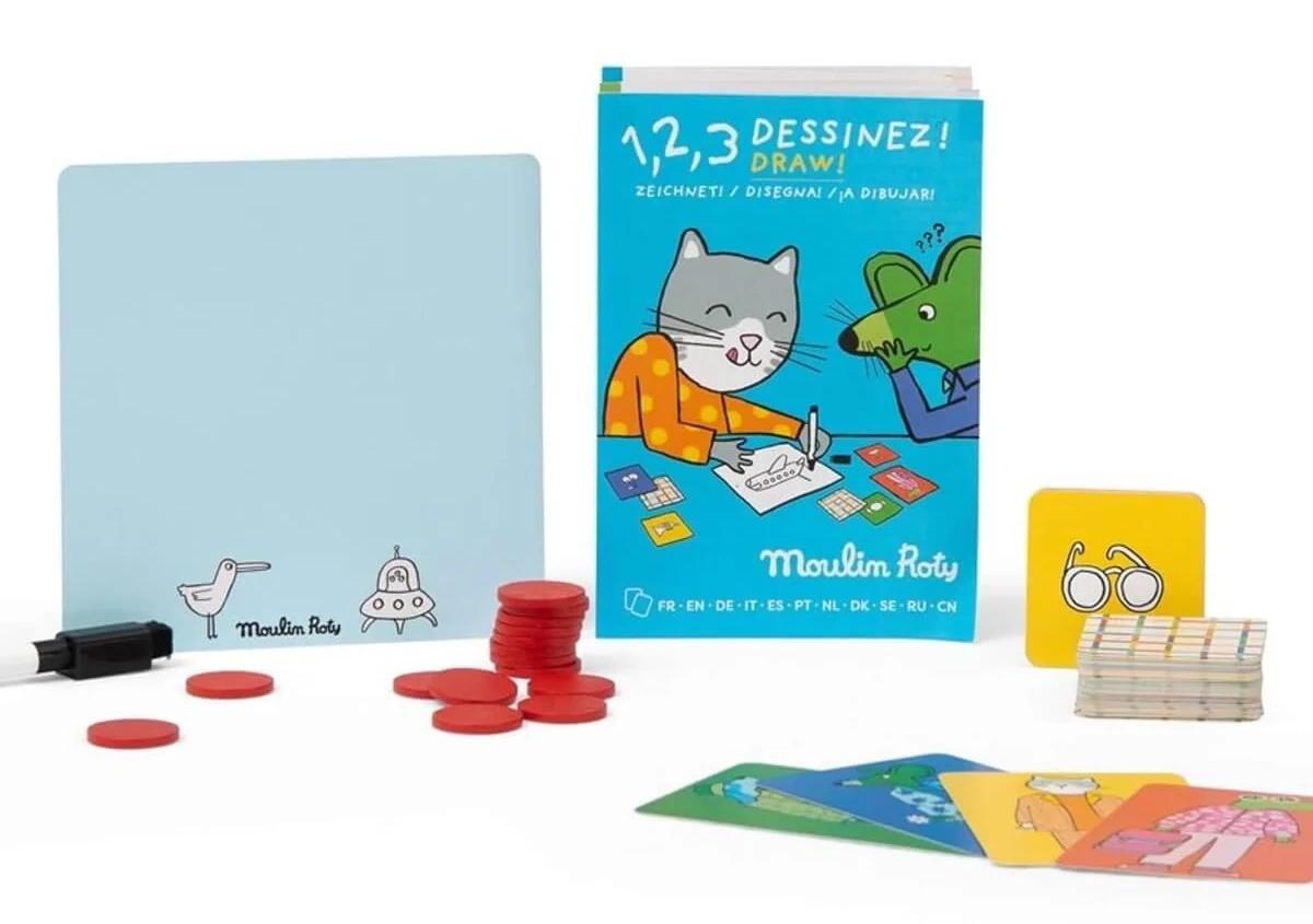 Descoperiți captivantul joc de familie 1, 2, 3 Desenează! din colecția Les Loufoques de la Moulin Roty, un joc de desen pentru copii de la 5 ani. Un joc de societate distractiv și dinamic, în care jucătorii vor trebui să ghicească rapid desenele realizate de ceilalți jucători.