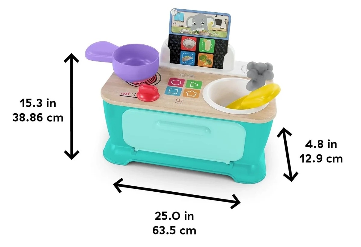 În Modul Joacă, cei mici pot explora sunetele și melodiile gătitului. În Modul Descoperire, copiii pot explora mâncarea, culorile și formele în engleză, spaniolă, franceză și germană. 3 cartonașe cu rețete îl ajută pe copilul tău să „gătească” 6 rețete pentru micul dejun, prânzul sau cina folosind oala și lingura incluse.