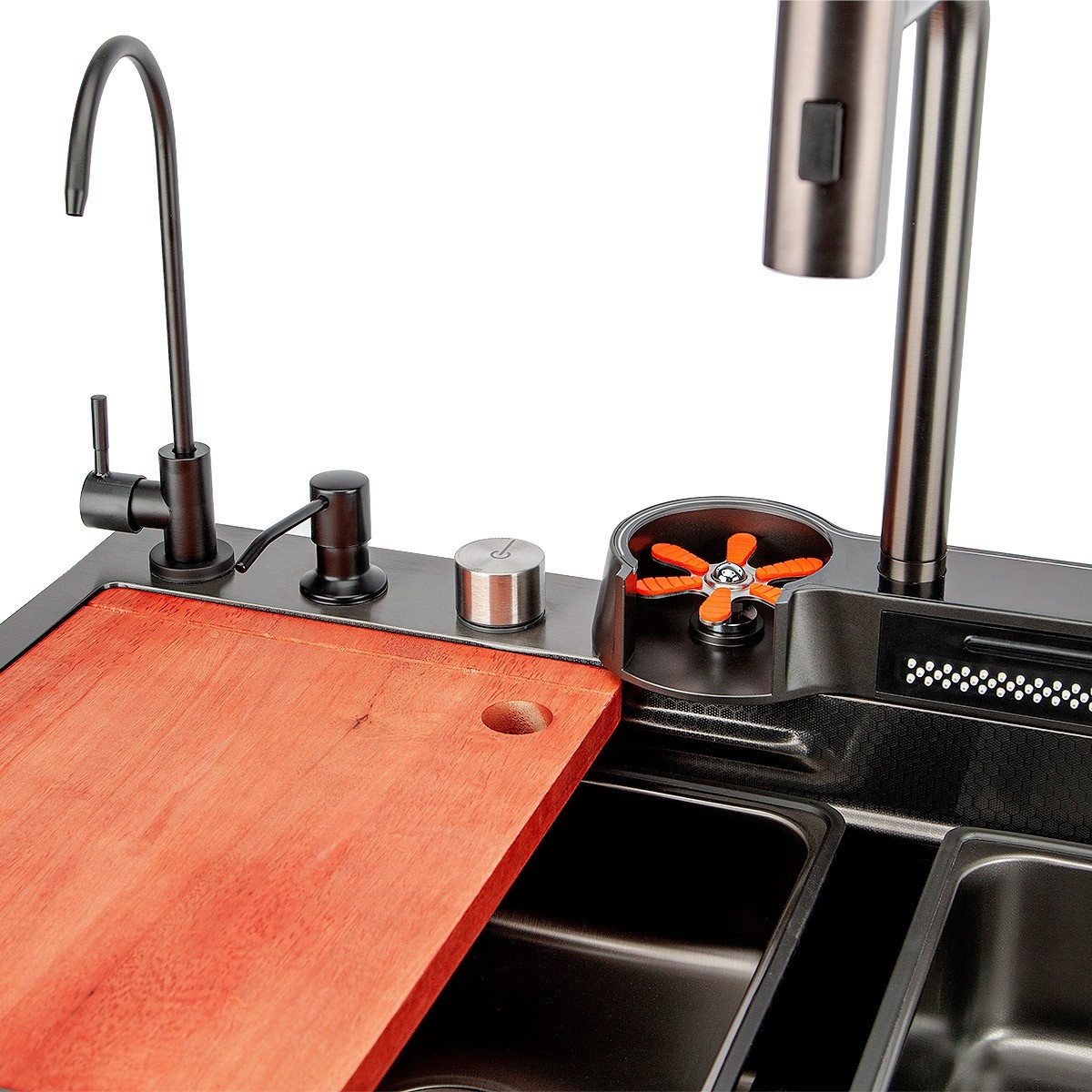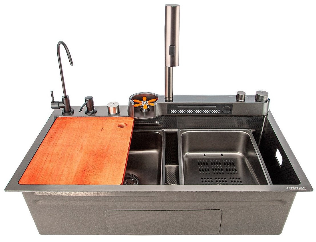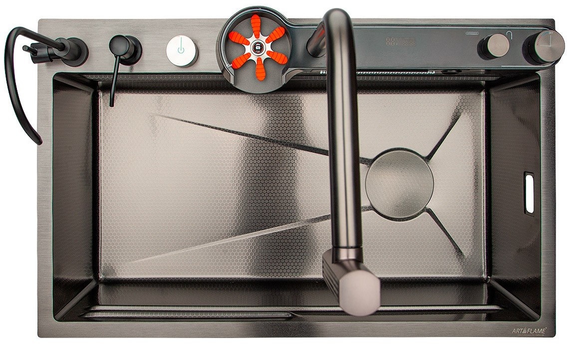 Inclus în setChiuveta include un sistem cu 2 grile pentru spălarea sau uscarea alimentelor și un dozator pentru spălarea vaselor, o mașină de spălat pahare, un tocător de bucătărie, un termostat și iluminat care funcționează din forța fluxului de apă, fără electricita