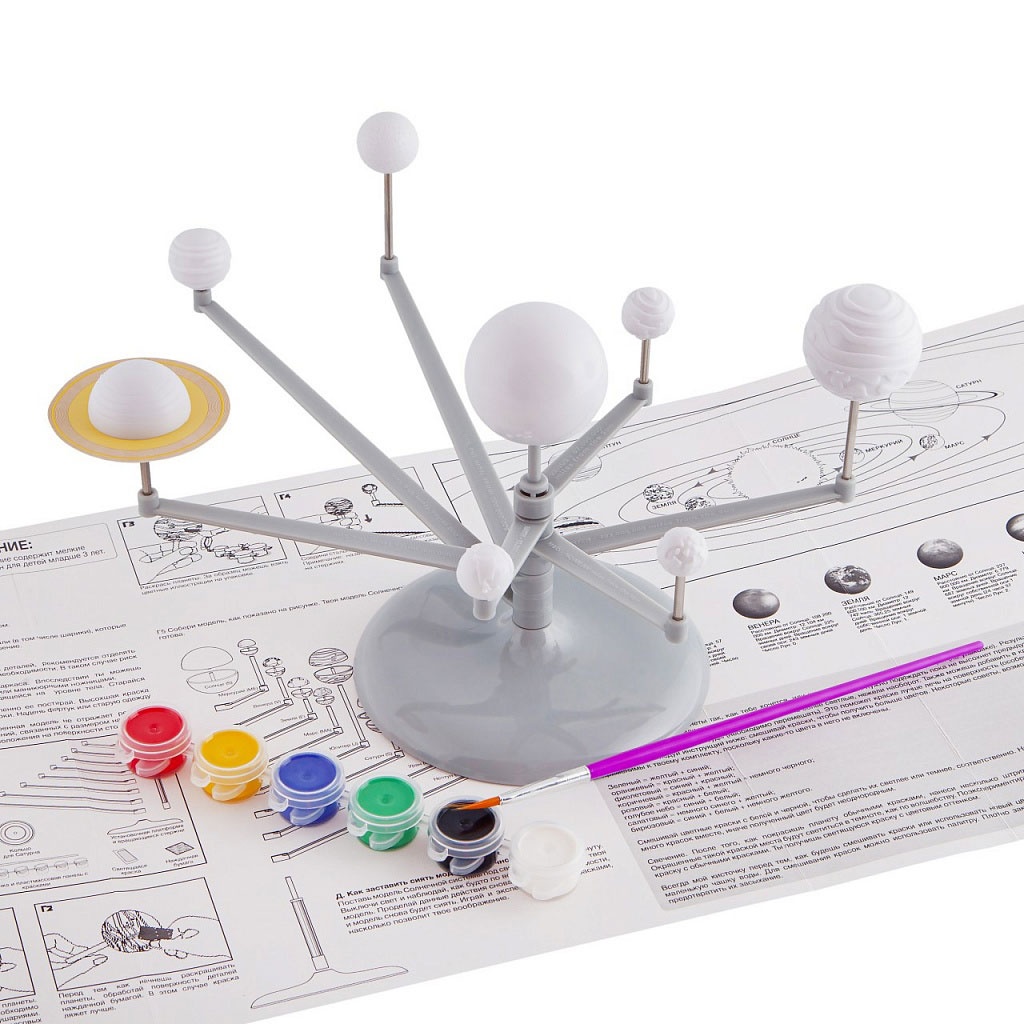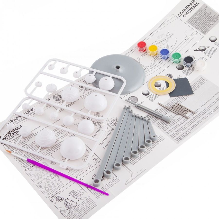 Intră în setmodel 3D al sistemului solar, stand de amenajare, ciucure, 6 vopsele de diferite culori, vopsea fluorescenta, 9 tije pentru planete, șmirghel, model de inele de saturn, instrucție