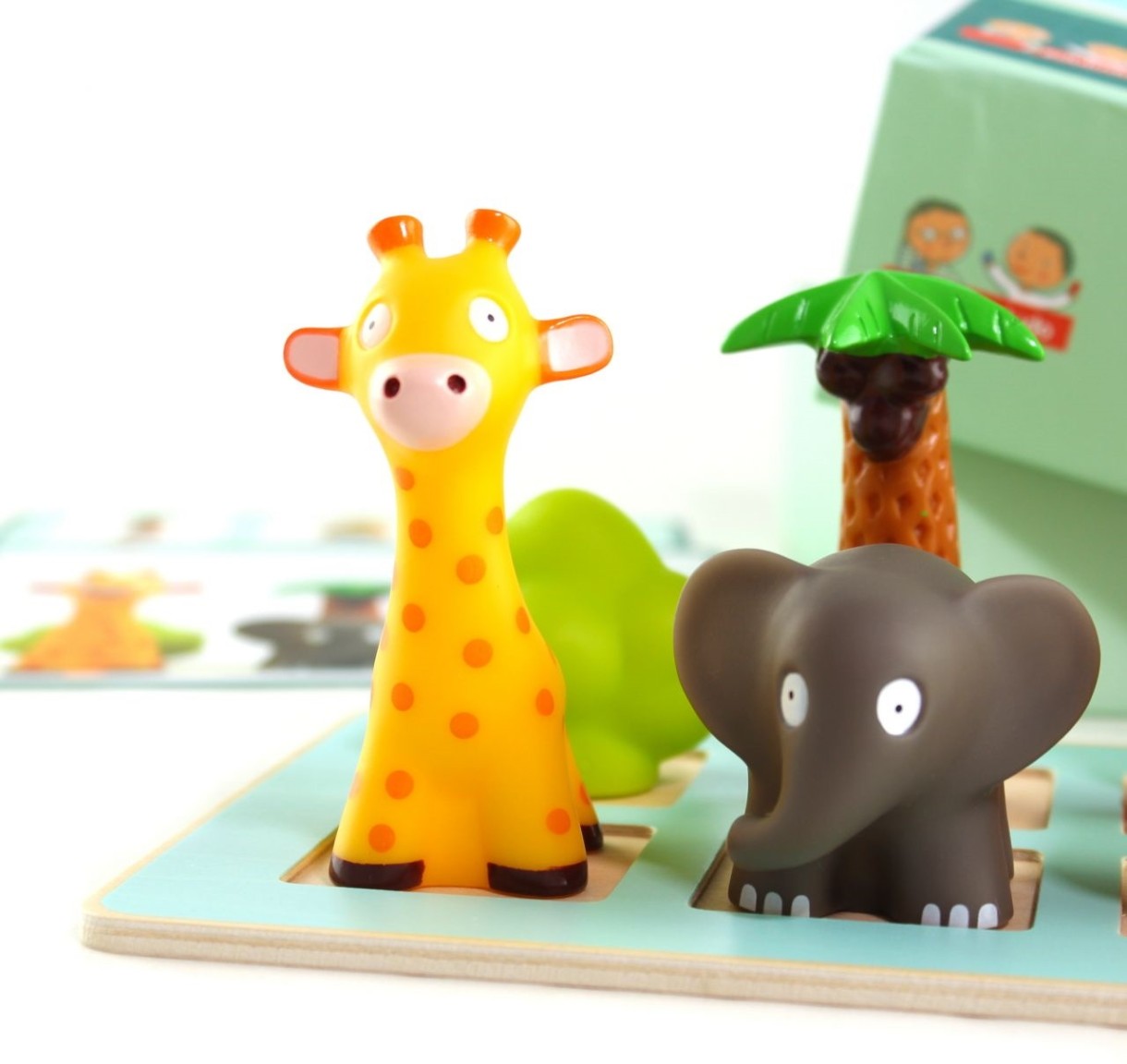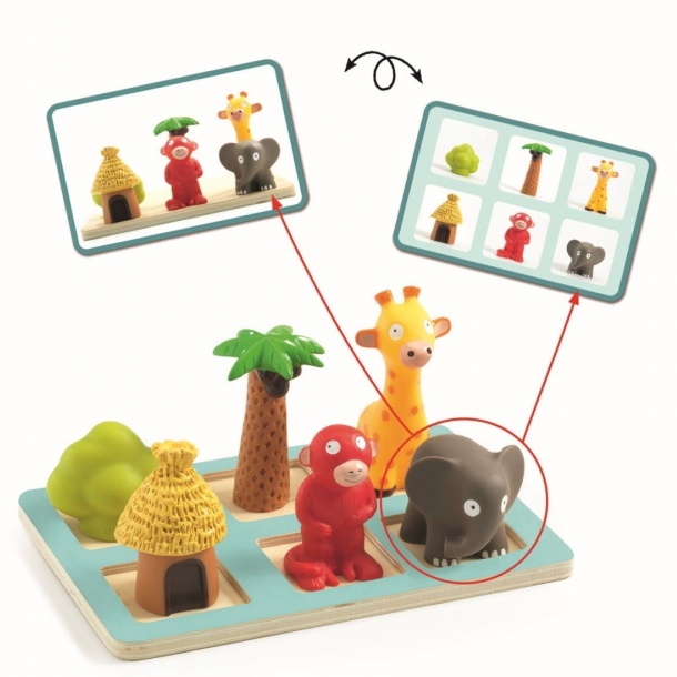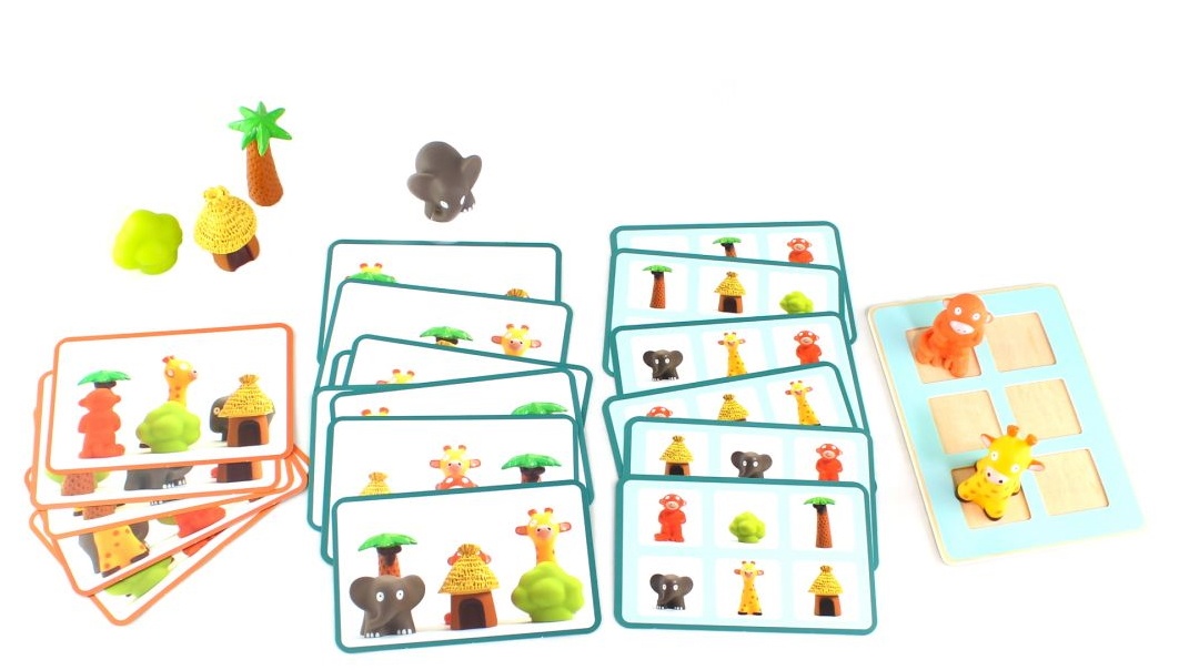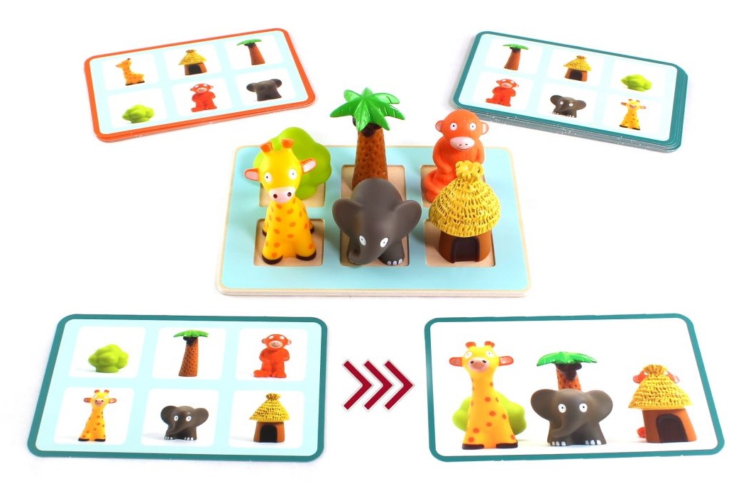 Intra in setsuport din lemn, 6 figurine de animale, 20 de carduri de sarcini