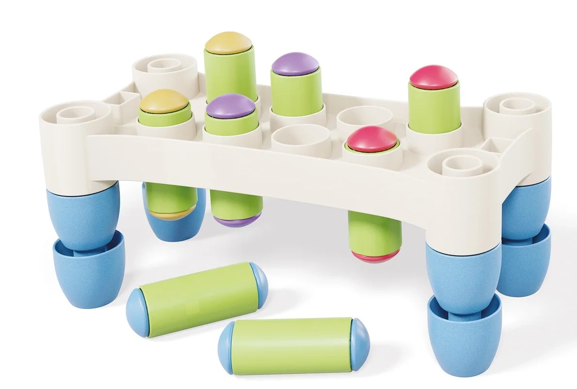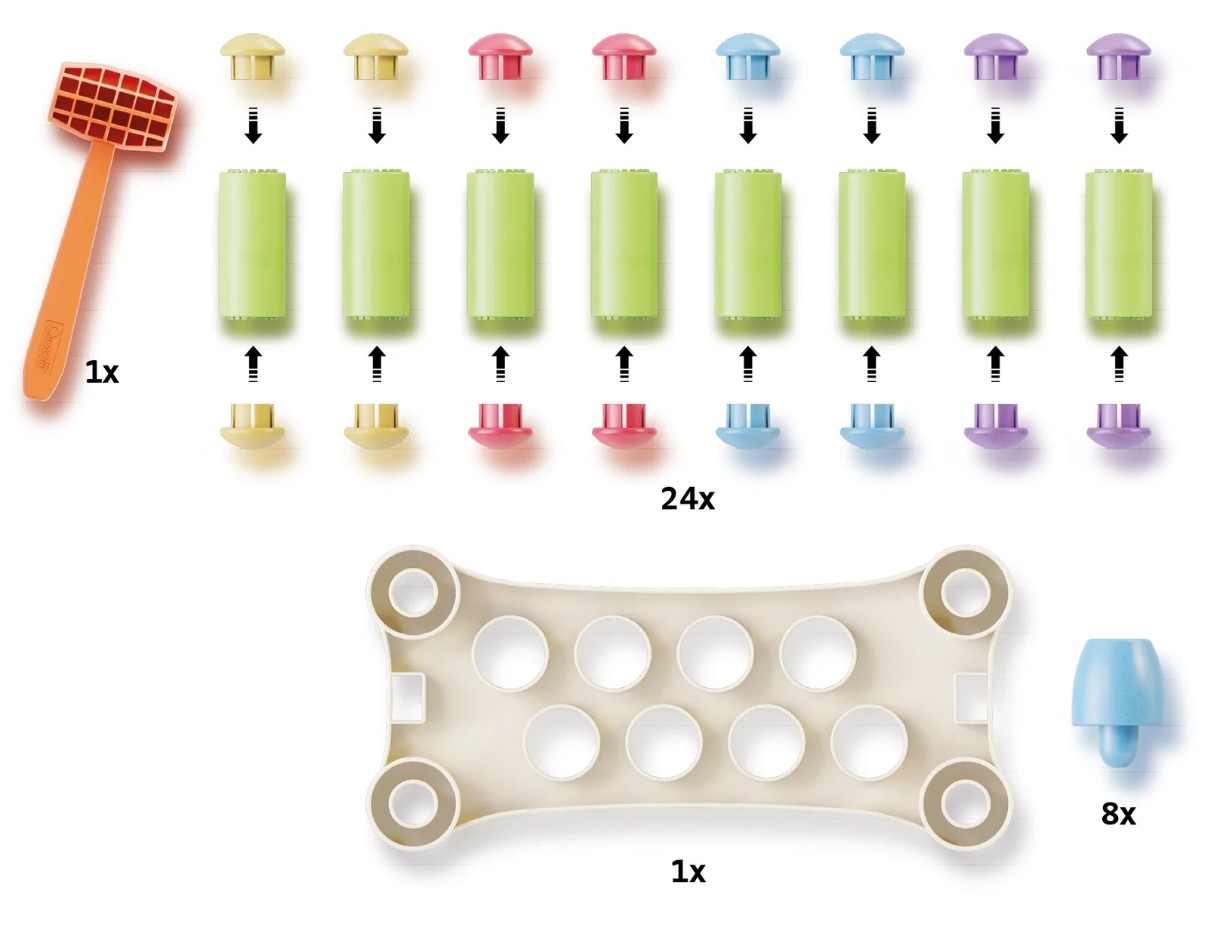 Intra in set1 ciocan, 8 cuie pentru asamblare, formate din 8 cilindri si 16 nasturi colorati, 1 baza alba, 8 picioare colorate