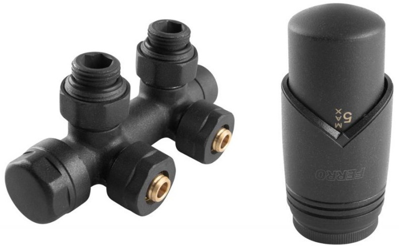 Completareacap termostatic GT33, supapă unghiulară integrată, fitinguri pentru țevi de cupru de 15 mm, fitinguri pentru țevi multistrat 16x2mm, mameluri pentru radiator 3/4 "x 1/2"