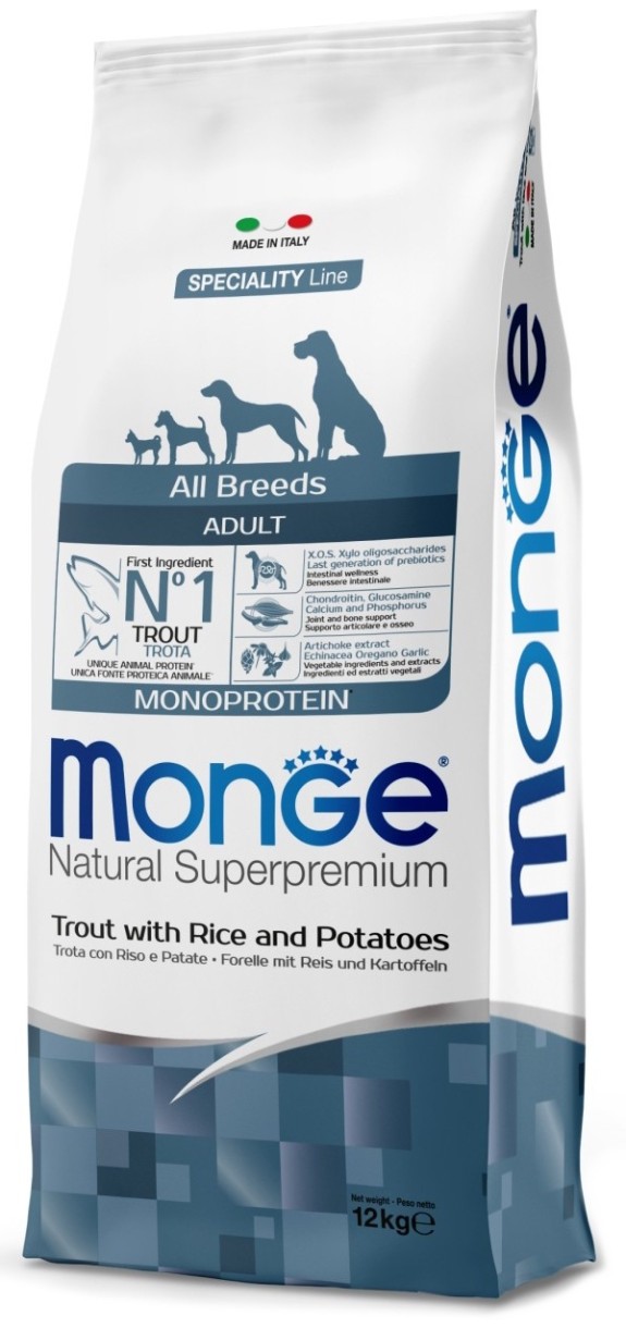 Hrană uscată pentru câini Monge Superpremium All Breeds Adult Trout/Rice/Potatoes 12kg