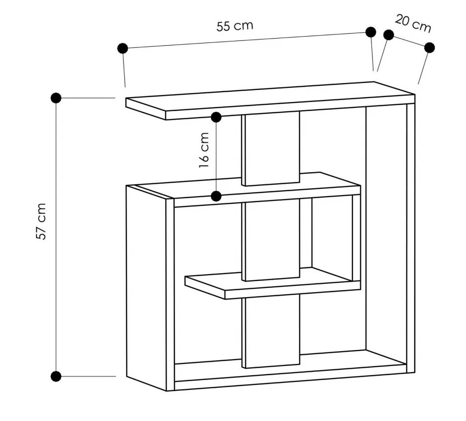 Dimensiunile de 55×57×20 cm asigură un spațiu bine organizat pentru obiectele esențiale, iar distanța suplimentară dintre rafturi oferă posibilități eficiente de depozitare.