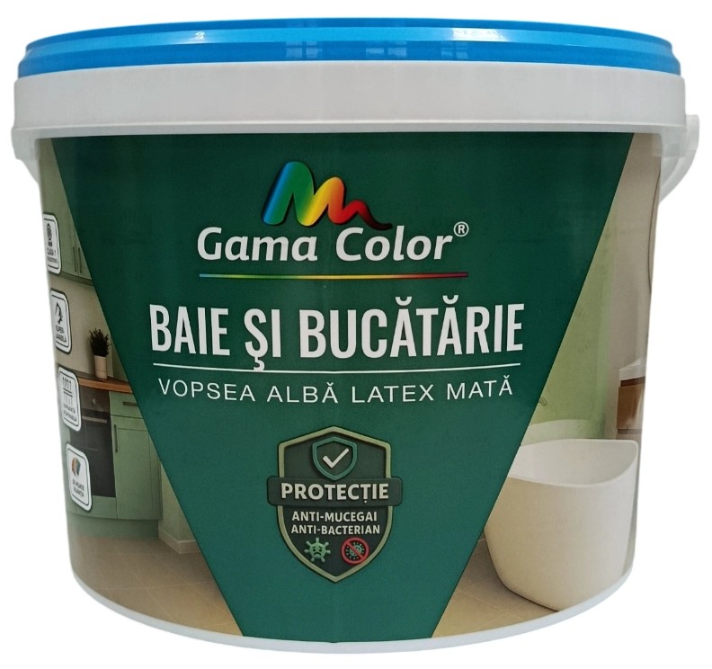 Vopseaua lavabilă Baie și Bucătărie Gama Color este o vopsea latex mată, albă, rezistentă la spălări repetate și special creată pentru încăperi cu umiditate ridicată. Este ideală pentru vopsirea pereților și tavanelor din băi, bucătării și alte zone expuse la condens, umezeală și murdărie. Vopseaua se utilizează pentru suprafețe minerale – tencuială, ciment-var, gips-carton, precum și plăci de ciment, oferind un strat decorativ durabil.