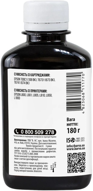 Recipient cu cerneală Barva Epson L800 Black 180 ml (L800‑409) este un rezervor de cerneală neagră de înaltă calitate, cu un volum de 180 ml, special conceput pentru imprimante și MFP-uri Epson din seriile L800, L805, L810, L850, L1800 echipate cu sistem CISS (alimentare continuă cu cerneală). Cernelurile Barva oferă un negru profund, contururi clare ale textului și un contrast ridicat, fiind ideale pentru documente și fotografii. Formula stabilă facilitează umplerea rezervorului fără blocaje, previne înfundarea capului de imprimare și asigură durabilitatea echipamentului. Este o soluție economică și fiabilă pentru acasă și birou, garantând imprimări de înaltă calitate și rezistență la decolorare.