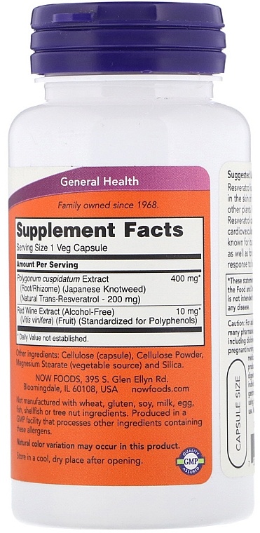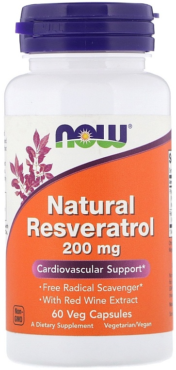 Doza de resveratrol din Now Foods Natural Resveratrol este de 200 mg. Este un polifenol care se găsește în concentrații mari în cojile strugurilor roșii. Conform studiilor recente, resveratrolul poate susține sănătatea inimii și a vaselor, precum și îmbătrânirea lentă a celulelor și poate neutraliza stresul biologic. Componentele suplimentare ale aditivului alimentar sunt celuloza (o capsulă este formată din acesta), pulberea de celuloză și dioxidul de siliciu. La fabricarea acestui produs nu s-au folosit grâu, gluten, soia, lapte, ouă, pește, crustacee sau nuci.